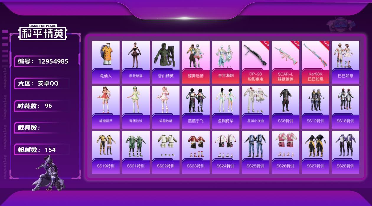 [12954985]安卓 手Q-2粉装-3特效枪-1粉色飞行器-4w热力值-8王牌印记-96套装-154枪皮【热门品类】:套装-龟仙人【粉色套装】:粉装-蝶舞迷情,粉装-金丰海韵【粉色枪皮等级】:SCAR-L-锦绣绵绵(五级),Kar98K-巳巳如意(五级),DP-28-豹影疾电(五级)【粉色飞行器】:黄族统领飞行器