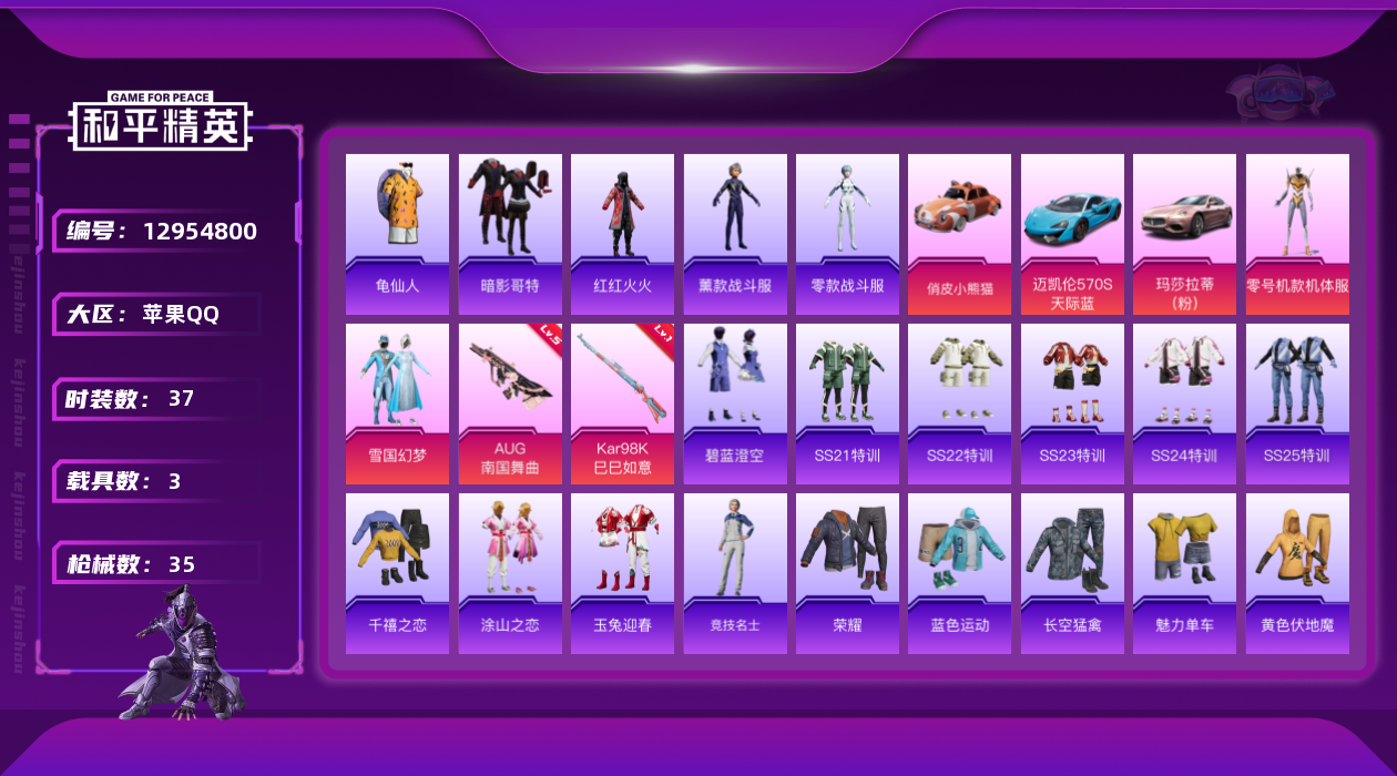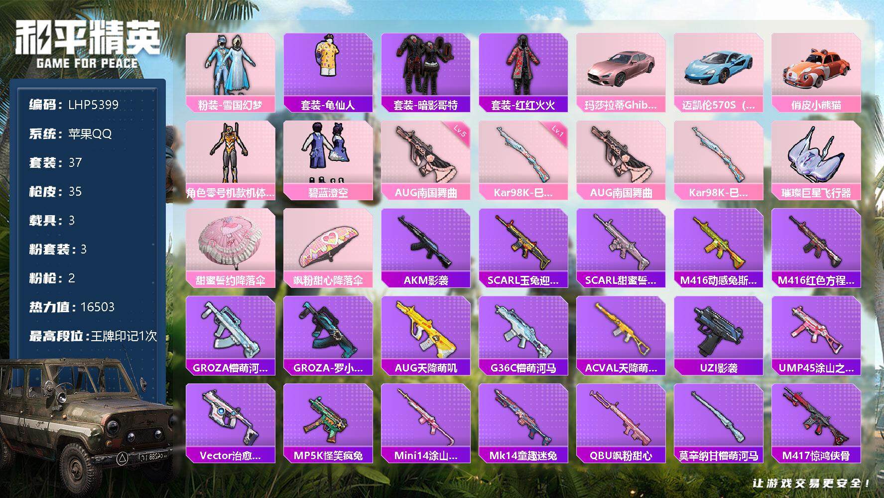 [12954800]素材身法号【特价急出/详情看图】:苹果 手Q-3粉装-2特效枪-3载具-1粉色飞行器-1.6w热力值-1王牌印记-37套装-35枪皮【热门品类】:粉装-雪国幻梦,套装-龟仙人,套装-暗影哥特,套装-红红火火【粉色载具】:玛莎拉蒂Ghibli(粉),迈凯伦570S(天际蓝),俏皮小熊猫【粉色套装】:粉装-雪国幻梦,角色-零号机款机体服,粉装-碧蓝澄空【粉色枪皮等级】:AUG-南国舞曲(五级),Kar98K-巳巳如意(一级)【粉色飞行器】:璀璨巨星飞行器