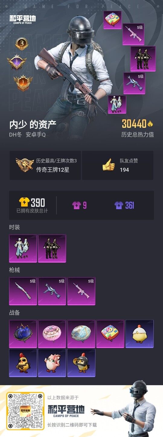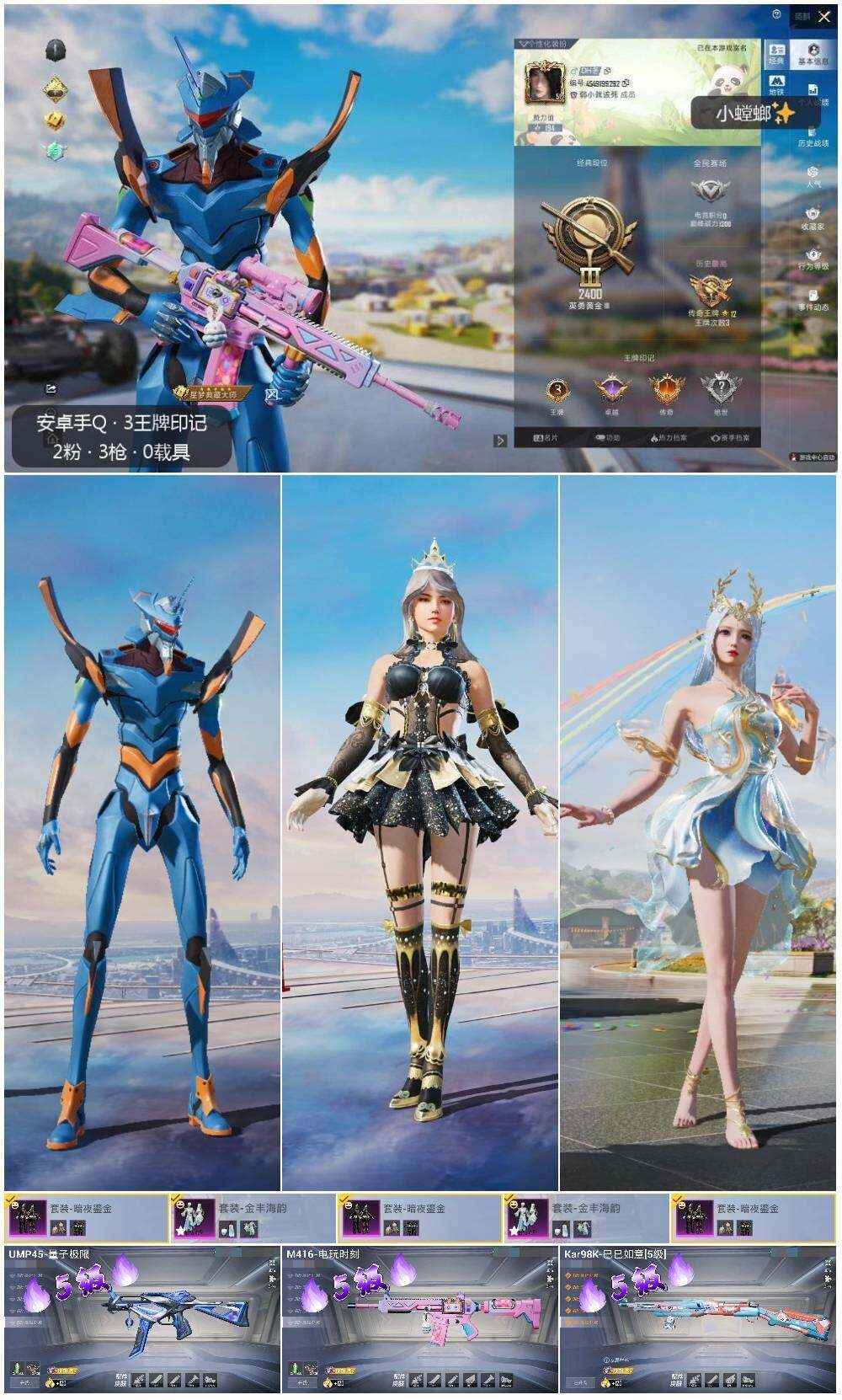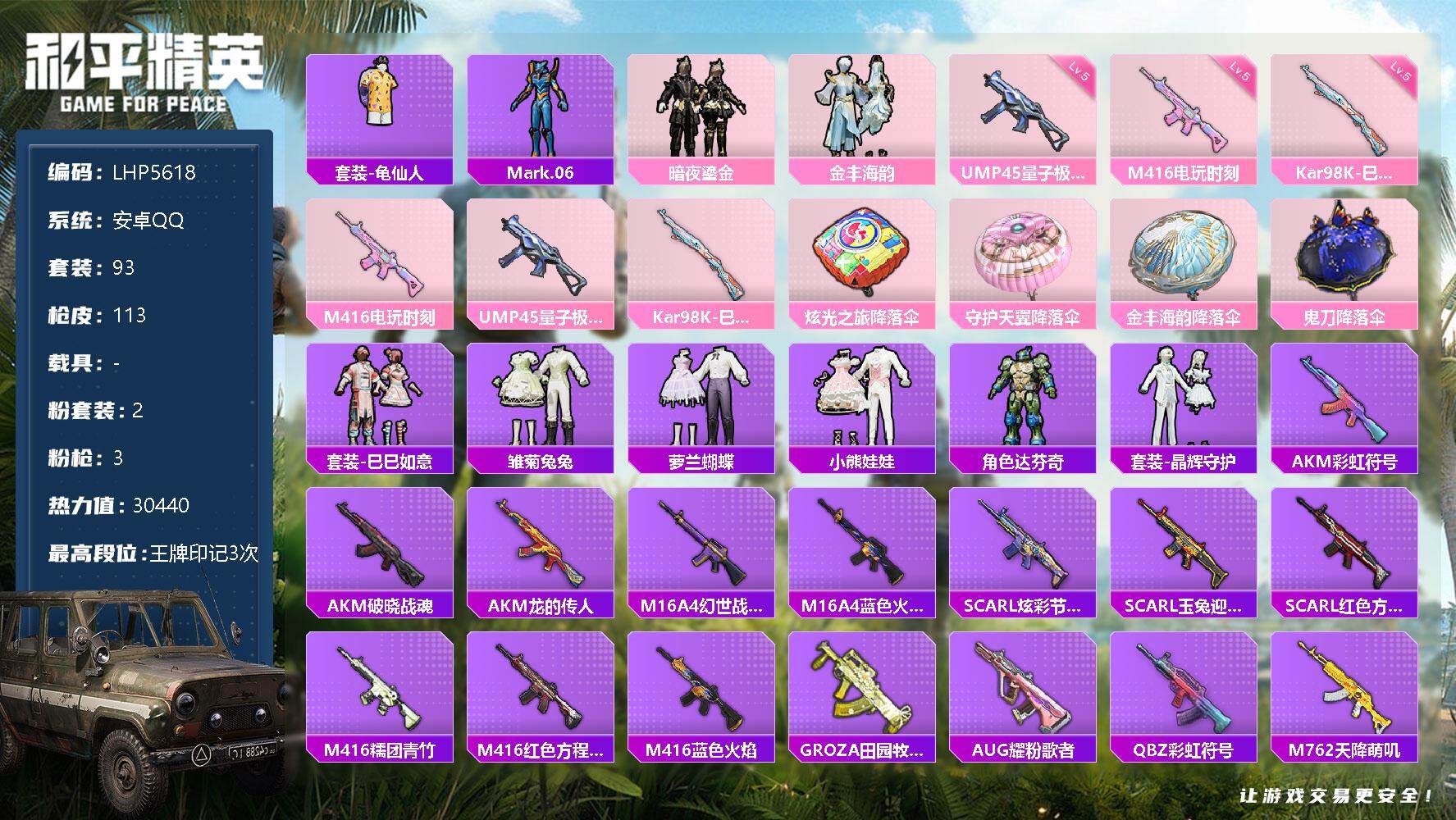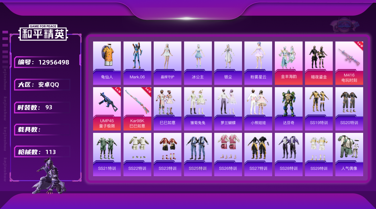 [12956498]安卓 手Q-2粉装-3特效枪-3w热力值-3王牌印记-93套装-113枪皮【热门品类】:套装-龟仙人,角色-Mark.06【粉色套装】:粉装-暗夜鎏金,粉装-金丰海韵【粉色枪皮等级】:M416-电玩时刻(五级),UMP45-量子极限(五级),Kar98K-巳巳如意(五级)