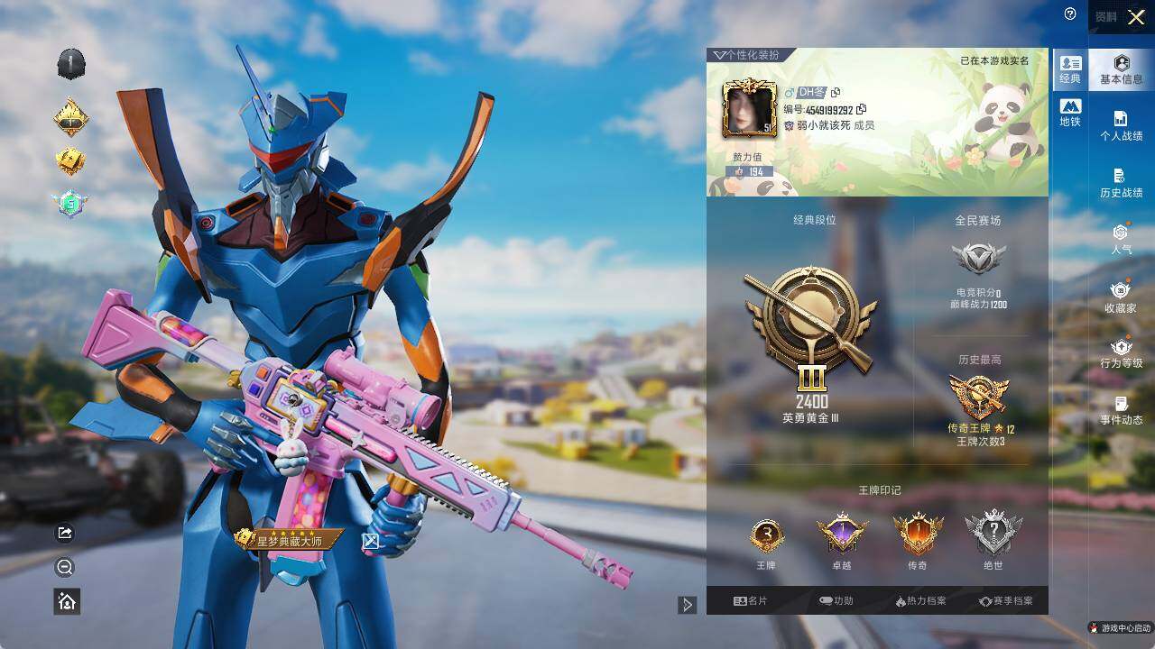 - [12113792]2粉装 2特效枪 可二次 可修改实名 身法装备:8号机(新粉螳螂) 优质装备:Kar98K创世·救赎,Kar98K-巳巳如意 热门装扮:闪光银龙,创世·救赎 四级特效枪:四级Kar98K-创世·救赎 三级特效枪:三级Kar98K-巳巳如意 紫色装扮:SS31特训套装,SS33特训套装,酒红色名流,长空猛禽,蓝彩潮人,鹤鸣,龟仙人,极速红龙,深蓝色名流,幻影武者,破蛋小黄鸡,灼焰舞者,猛禽,创世·幻影,SS28特训,8号机(新粉螳螂),鱼渊荷华,玉兔迎春,巳巳如意,海琴烟,竞技名士,粉红小猪,焰鹰斗篷,幻羽潜行,智谋强哥,耀粉歌者 优质战备:创世·救赎降落伞,精灵梦叶罗丽降落伞,江南烟雨降落伞,太空嘟嘟降落伞,飞行翼-星夜魔法师