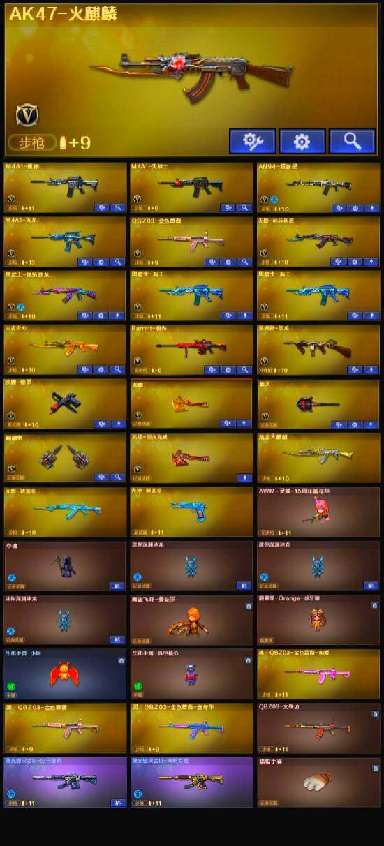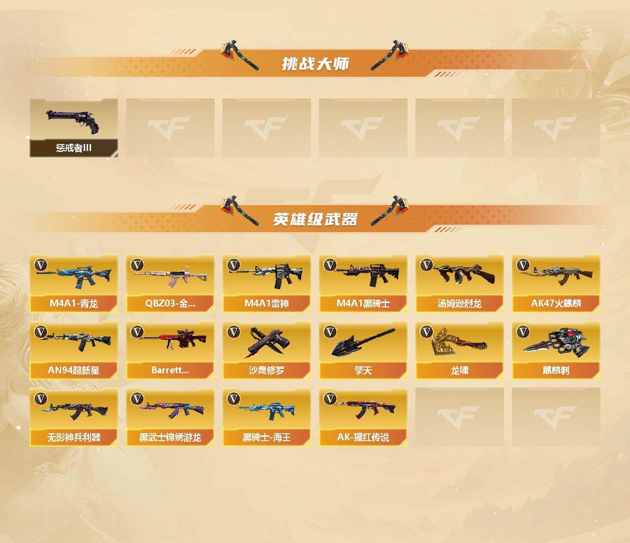 【英雄级武器】:QBZ03-金色蔷薇,M4A1-青龙,无影-神兵利器,M4A1-雷神,M4A1-黑骑士,汤姆逊-烈龙,AK47-火麒麟,AN94-超新星,Barrett-极光,黑武士-锦绣游龙,黑骑士-海王*2,AK-47-猩红传说,沙鹰-修罗,麒麟刺,擎天,龙啸