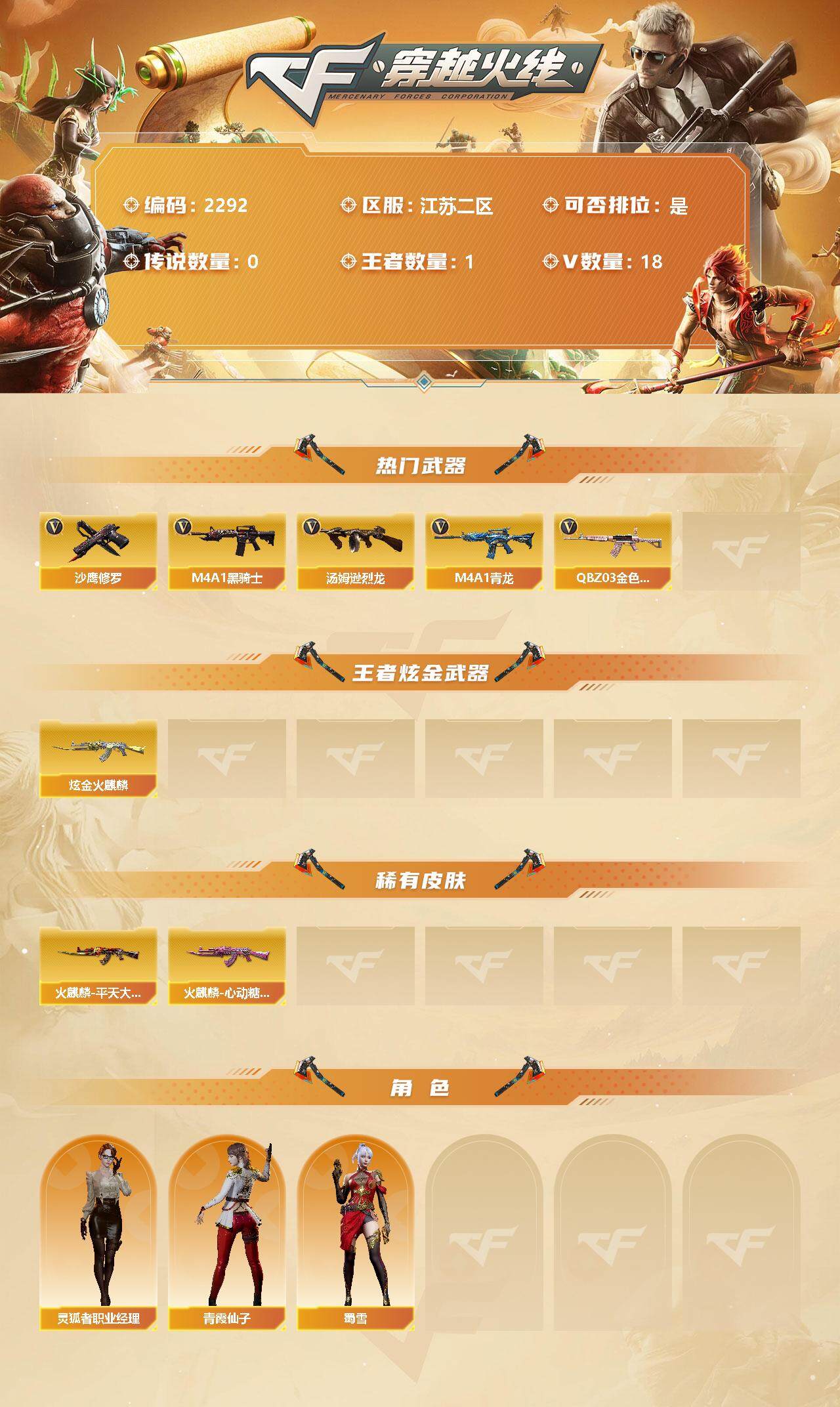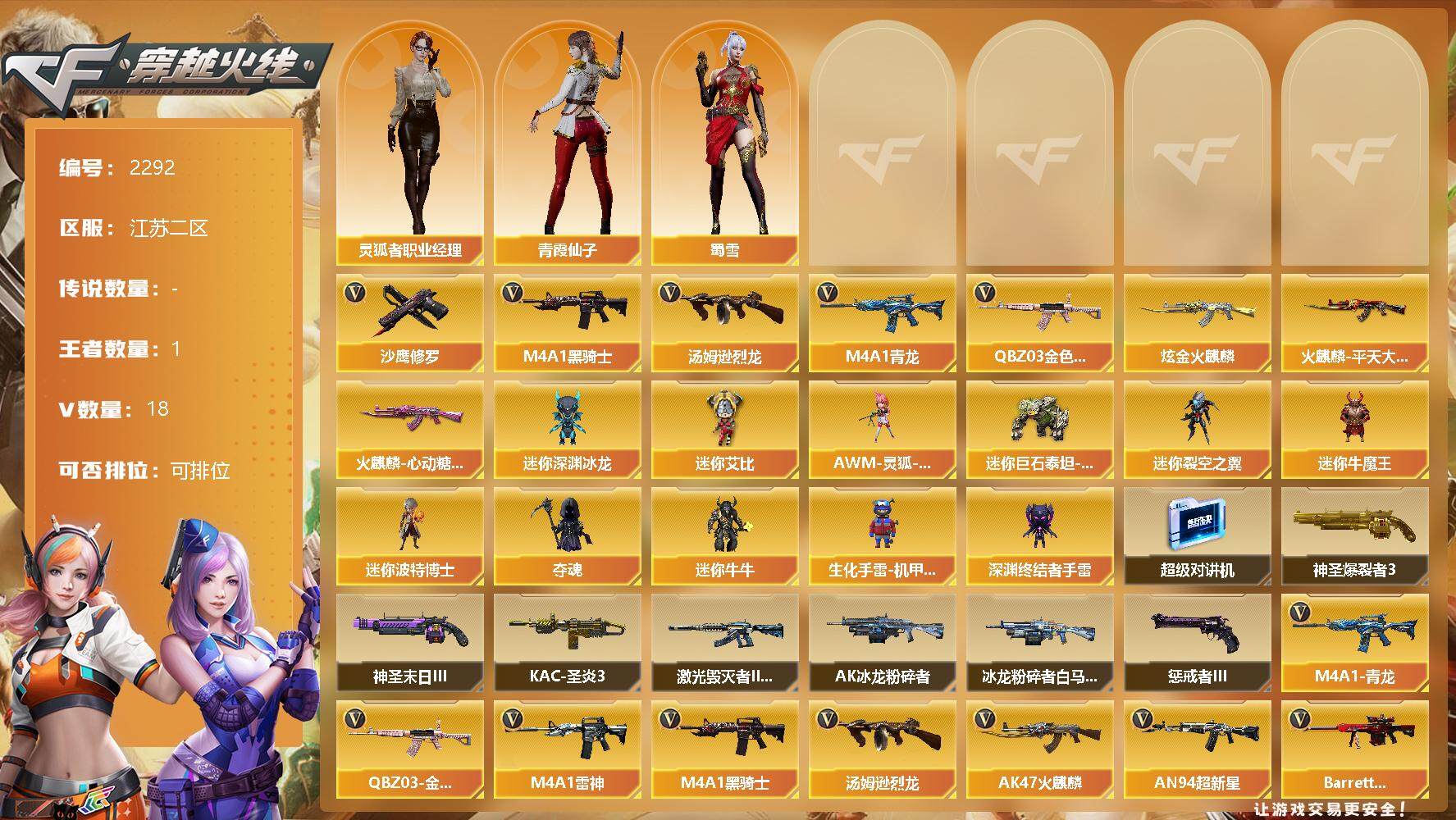 [12955909]江苏二区-18V-1王者-1炫金 【热门武器】:QBZ03-金色蔷薇,M4A1-青龙,M4A1-黑骑士,汤姆逊-烈龙,沙鹰-修罗 【王者炫金武器】:炫金火麒麟 【稀有皮肤】:火麒麟-平天大圣*2,火麒麟-心动糖果 【角色】:灵狐者-职业经理,蜀雪,青霞仙子 【人偶武器】:AWM-灵狐-15周年嘉年华,迷你深渊冰龙*3,迷你艾比,迷你巨石泰坦-魔花研究所,迷你裂空之翼,迷你牛魔王,迷你波特博士,夺魂,迷你牛牛,生化手雷-机甲核心,深渊终结者手雷*3 【暴走生化】:超级对讲机 【挑战大师】:神圣爆裂者III,神圣爆裂者-末日III,KAC-圣炎切割者III,惩戒者III,激光毁灭者III-白马银枪,AK47-冰龙粉碎者,冰龙粉碎者-白马银枪 【英雄级武器】:QBZ03-金色蔷薇,M4A1-青龙,无影-神兵利器,M4A1-雷神,M4A1-黑骑士,汤姆逊-烈龙,AK47-火麒麟,AN94-超新星,Barrett-极光,黑武士-锦绣游龙,黑骑士-海王*2,AK-47-猩红传说,沙鹰-修罗,麒麟刺,擎天,龙啸 【特殊枪械】:1黑骑士,1烈龙