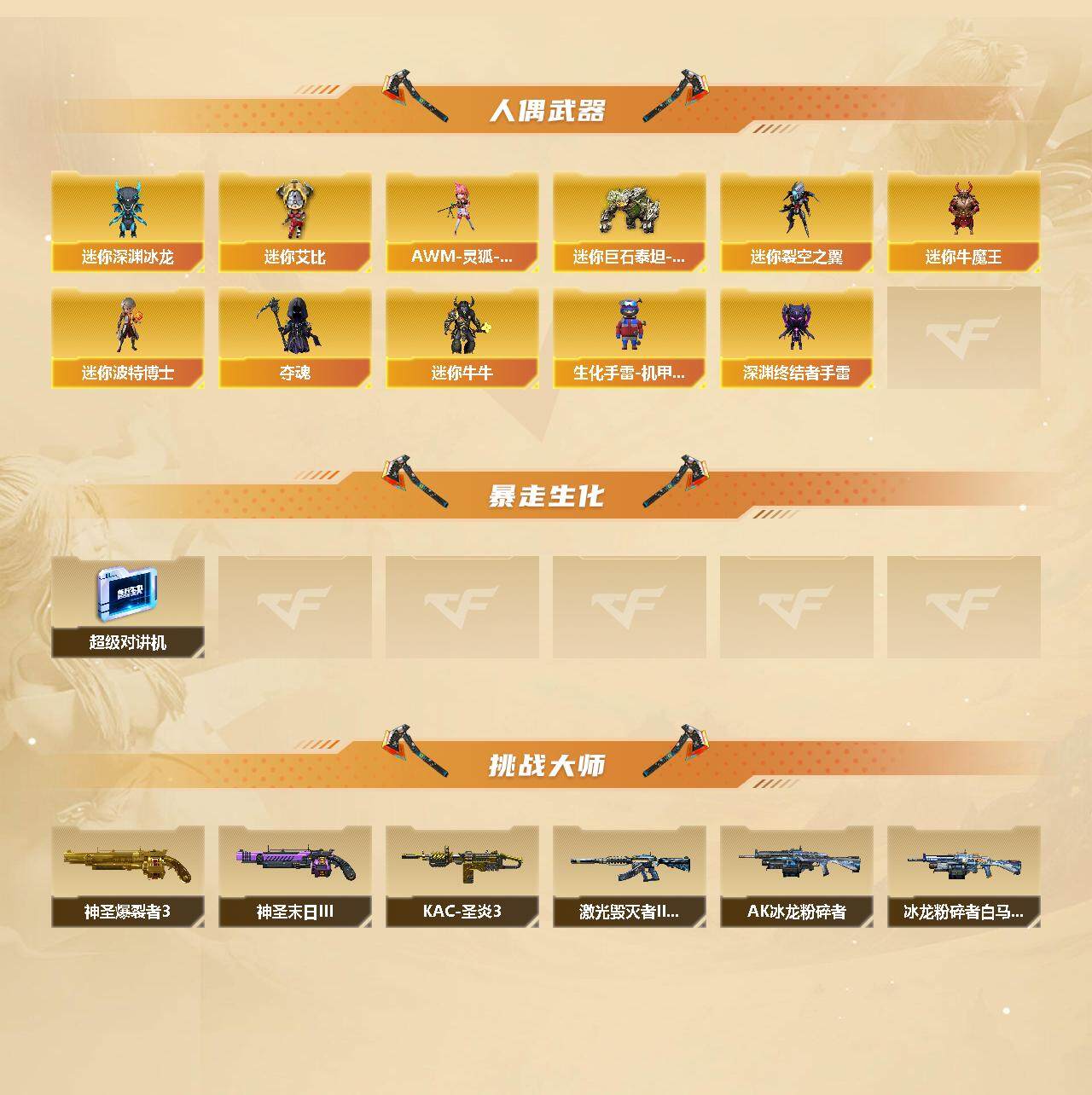 【人偶武器】:AWM-灵狐-15周年嘉年华,迷你深渊冰龙*3,迷你艾比,迷你巨石泰坦-魔花研究所,迷你裂空之翼,迷你牛魔王,迷你波特博士,夺魂,迷你牛牛,生化手雷-机甲核心,深渊终结者手雷*3