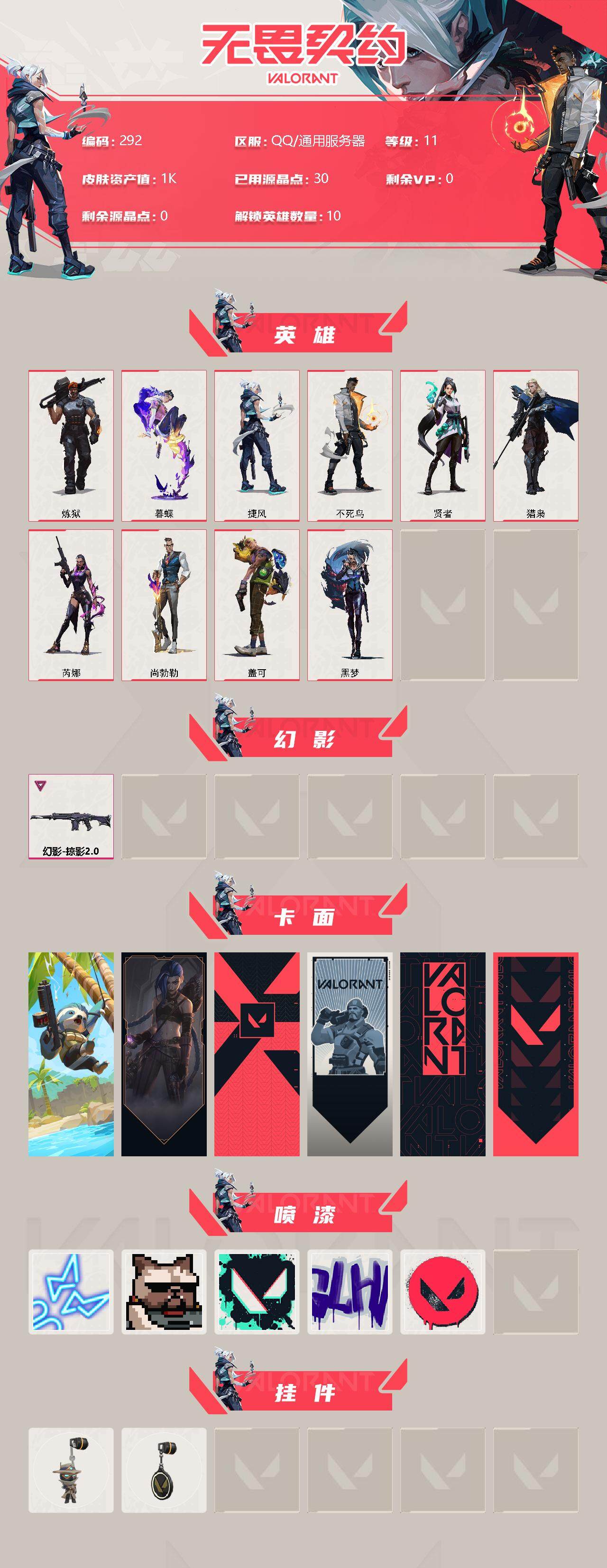 [12956648]【英雄】:炼狱,暮蝶,捷风,不死鸟,贤者,猎枭,芮娜,尚勃勒,盖可,黑梦 【幻影】:幻影-掠影//2.0 【卡面】:树懒大作战 卡面,《双城之战》金克丝 卡面,代号红色 卡面,新兵报到 卡面,V契约 卡面,无畏契约 卡面 【喷漆】:霓光四射 喷漆,关门放狗 喷漆,胜利属于无畏契约 喷漆,GLHF 喷漆,无畏契约 喷漆 【挂饰】:无畏契约GO!第一卷 零 挂饰,无畏契约 纪念币 挂饰