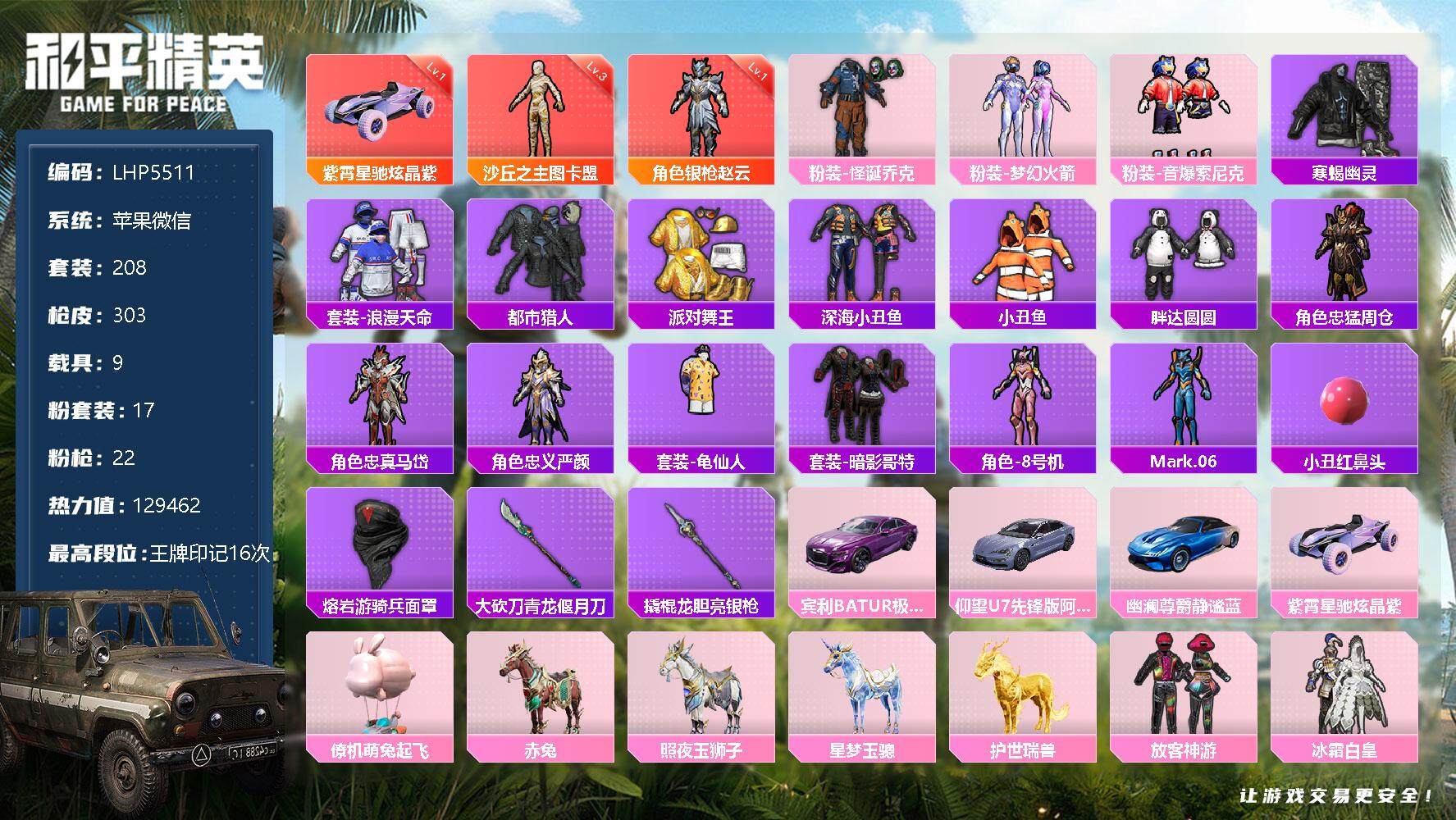 - [10828860]【商品标题】:安卓 手Q-1粉装-5特效枪-0载具-36353热力值-3印记-103套装-137枪皮 【特效枪等级】:AKM-绿萝繁花(五级),Kar98K-创世·救赎(六级),Kar98K-巳巳如意(五级),Mk14-甜梦熊击(五级),DP-28-豹影疾电(一级) 【优质套装】:角色-萨利娅 【稀有套装】:套装-龟仙人,套装-巳巳如意,角色-临安公主,套装-燕燕于飞,套装-鱼渊荷华,套装-霓虹热舞,套装-极速光影,套装-云朵鹅,套装-雪绒豹 【优质武器皮肤】:AKM-绿萝繁花,Kar98K-创世·救赎,Kar98K-巳巳如意,Mk14-甜梦熊击,DP-28-豹影疾电 【稀有武器皮肤】:AKM-彩虹符号,AKM-灼热熔岩,AKM-霓虹街区,AKM-龙的传人,M16A4-幻世战舞者,M16A4-千金淑猫,SCAR-L-夜灯,SCAR-L-玉兔迎春,SCAR-L-红色方程式,M416-糯团青竹,M416-红色方程式,M416-绯红前夜,M416-蓝色火焰,GROZA-彩虹符号,AUG-耀粉歌者,M762-天降萌叽,M762-奇异狩猎者,M762-彩虹符号,M762-绯红前夜,M762-云朵鹅,AC-VAL-天降萌叽,蜜獾-天降萌叽,蜜獾-娇憨猪猪,UZI-啾咪啾咪,UZI-天降萌叽,UZI-娇憨猪猪,UZI-红色方程式,UMP45-夜灯,UMP45-涂山之恋,UMP45-生命誓言,UMP45-蓝色火焰,Vector-彩虹符号,汤姆逊-天降萌叽,汤姆逊-炫彩节奏,汤姆逊-耀粉歌者,野牛-沙丘之主,P90-巳巳如意,Kar98K-彩虹符号,Kar98K-炫彩节奏,Kar98K-红色方程式,M24-影袭,AWM-圣堂之誓,SKS-炫彩节奏,SKS-糯团青竹,VSS-彩虹符号,Mini14-涂山之恋,Mini14-耀粉歌者,SLR-娇憨猪猪,SLR-彩虹符号,M417-惊鸿侠骨,M200-惊鸿侠骨,SVD-云朵鹅,S686-奇异狩猎者,S686-生命誓言,S686-红色方程式,S686-巳巳如意,S1897-炫彩节奏,S12K-玩趣呆呆,S12K-音爆索尼克,S12K-夜灯,S12K-娇憨猪猪,DBS-彩虹符号,DBS-创世·救赎,AA12-G-炫光之旅,SPAS-12-云朵鹅,M249-彩虹符号,DP-28-彩虹符号,MG3-惊鸿侠骨,MG3-瑞龙福将,短管霰弹-竹节火铳,
