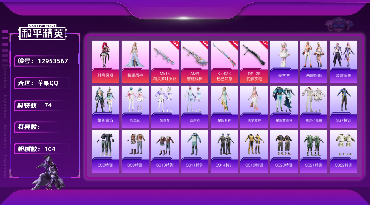 [12953567]【特价急出/详情看图】:苹果 手Q-2粉装-4特效枪-3.3w热力值-6王牌印记-74套装-104枪皮【粉色套装】:角色-智耀战神,角色-绯穹魔姬【粉色枪皮等级】:Kar98K-巳巳如意(五级),Mk14-精灵梦叶罗丽(六级),AMR-智耀战神(六级),DP-28-豹影疾电(一级)