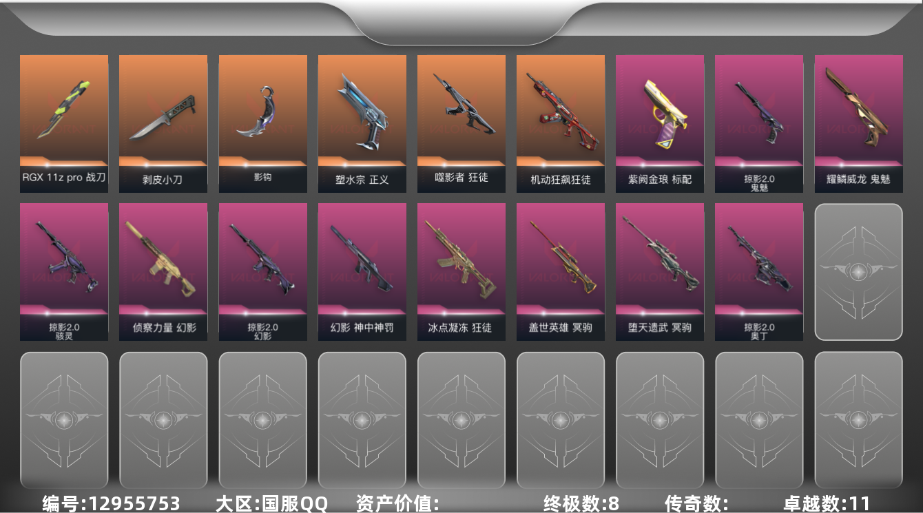 [12955753]【套装】:掠影//2.0套装 【英雄】:炼狱,暮蝶,钛狐,壹决,铁臂,捷风,幽影,不死鸟,贤者,猎枭,蝰蛇,零,芮娜,奇乐,尚勃勒,霓虹,斯凯,夜露,K/O,盖可,黑梦 【近战 武器】:近战武器-剥皮小刀,近战武器-RGX 11z Pro 战刀,近战武器-影钩 【狂徒】:狂徒-机动狂飙,狂徒-噬影者,狂徒-冰点凝冻,狂徒-诡秘蛇影 【幻影】:幻影-侦察力量,幻影-神中神罚,幻影-掠影//2.0,幻影-末日之翼 【戍卫】:戍卫-折光棱晶 【冥驹】:冥驹-堕天遗武,冥驹-盖世英雄 【飞将】:飞将-末日之翼 【莽侠】:莽侠-诡秘蛇影 【奥丁】:奥丁-掠影//2.0,奥丁-末日之翼 【判官】:判官-诡秘蛇影 【骇灵】:骇灵-掠影//2.0 【蜂刺】:蜂刺-折光棱晶 【标配】:标配-紫阙金琅,标配-折光棱晶 【正义】:正义-塑水宗 【鬼魅】:鬼魅-耀鳞威龙,鬼魅-掠影//2.0 【短炮】:短炮-末日之翼 【卡面】:欢迎来到底城 卡面,南瓜盛典 卡面,无畏契约:暮蝶 卡面,正义的化身 卡面,最高舞台 卡面,红鳞松叶 卡面,梦幻奶茶 卡面,无畏契约GO!第一卷:芮娜 卡面,无畏契约GO!第一卷:零 卡面,无垠星环 卡面,《双城之战》金克丝 卡面,无畏契约GO!第一卷:贤者 卡面,钢锁vs盖可 卡面,别冒尖 卡面,代号红色 卡面,新兵报到 卡面,V契约 卡面,无畏契约 卡面 【喷漆】:都算到了 喷漆,伤心心 喷漆,超级粉丝 喷漆,捷风差距 喷漆,买装还是存钱 喷漆,无畏契约GO!第一卷:贤者 喷漆,胜利属于无畏契约 喷漆,GLHF 喷漆,无畏契约 喷漆 【挂饰】:第九季//第三幕 纪念币 挂饰,第九季//第二幕 纪念币 挂饰,薰衣草之心 挂饰,袖珍捷风 挂饰,Z世代特饮 挂饰,第九季//第一幕 纪念币 挂饰,天外飞客 挂饰,《双城之战》魄罗 挂饰,无畏契约 纪念币 挂饰