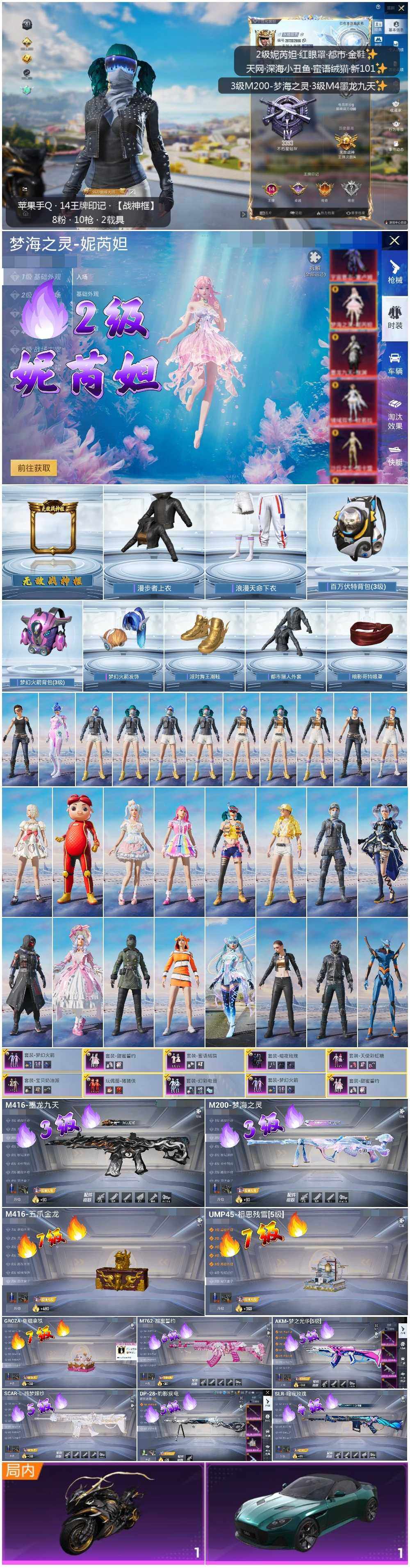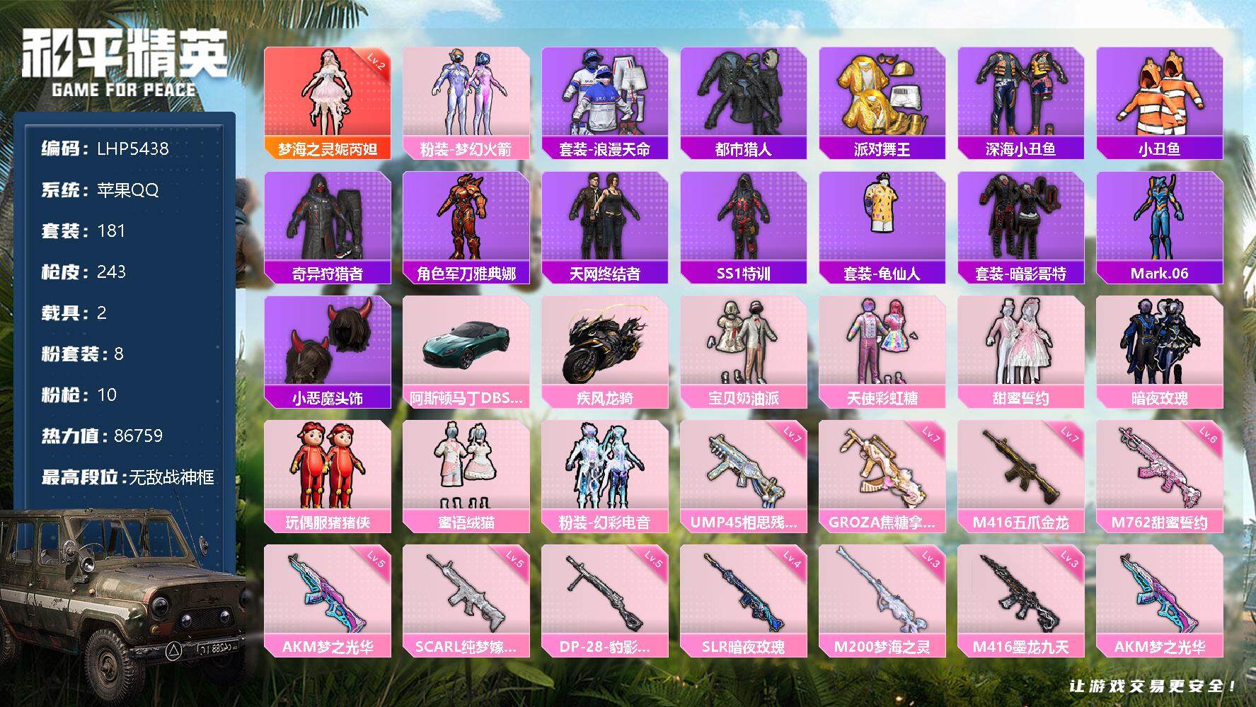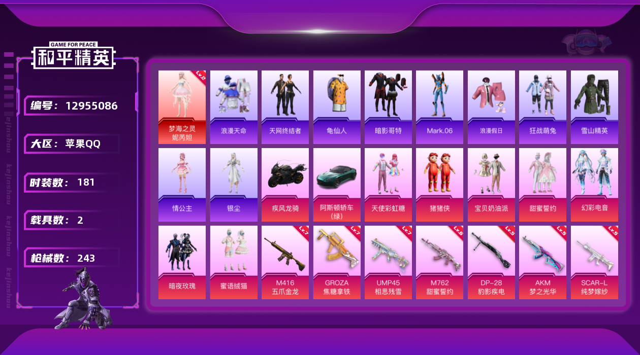 [12955086]素材身法号/无敌战神框1 苹果 手Q-无敌战神框-1神装-8粉装-10特效枪-2载具-4粉色飞行器-8.6w热力值-14王牌印记-181套装-243枪皮【红色神装等级】:梦海之灵-妮芮妲(二级)【热门品类】:粉装-梦幻火箭,套装-浪漫天命,套装-都市猎人,套装-派对舞王,套装-深海小丑鱼,套装-小丑鱼,套装-奇异狩猎者,角色-军刀雅典娜,套装-天网终结者,套装-SS1特训,套装-龟仙人,套装-暗影哥特,角色-Mark.06,小恶魔头饰【粉色载具】:阿斯顿马丁DBS(绿),疾风龙骑【粉色套装】:粉装-宝贝奶油派,粉装-天使彩虹糖,粉装-梦幻火箭,粉装-甜蜜誓约,粉装-暗夜玫瑰,玩偶服-猪猪侠,粉装-蜜语绒猫,粉装-幻彩电音【粉色枪皮等级】:AKM-梦之光华(五级),SCAR-L-纯梦嫁纱(五级),M416-五爪金龙(七级),M416-墨龙九天(三级),GROZA-焦糖拿铁(七级),M762-甜蜜誓约(六级),UMP45-相思残雪(七级),SLR-暗夜玫瑰(四级),M200-梦海之灵(三级),DP-28-豹影疾电(五级)【粉色飞行器】:梦幻火箭飞行器,龙翔九天飞行器,幻海精灵飞行器