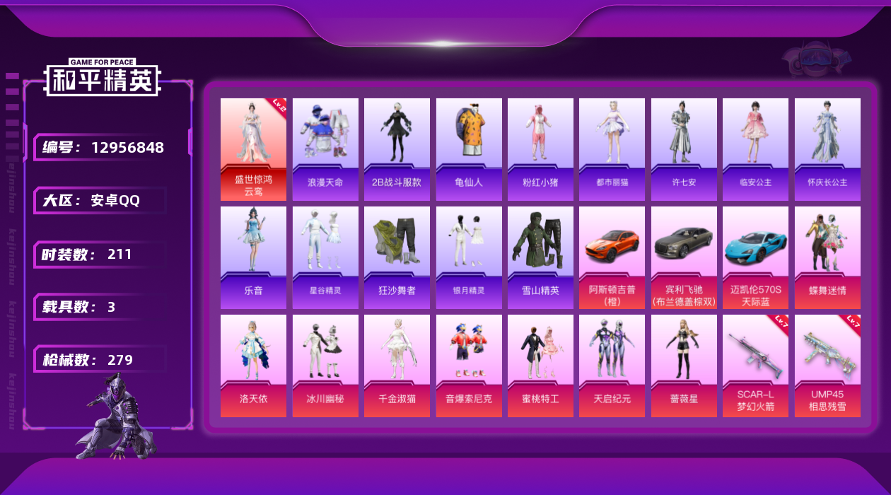 [12956848]素材身法号/地铁满天赋 安卓 手Q-1神装-8粉装-10特效枪-3载具-5粉色飞行器-9.5w热力值-11王牌印记-211套装-279枪皮【红色神装等级】:盛世惊鸿-云鸾(二级)【热门品类】:粉装-音爆索尼克,套装-浪漫天命,角色-2B战斗服款,套装-龟仙人,套装-粉红小猪,熔岩游骑兵面罩【粉色载具】:阿斯顿马丁DBX(橙),宾利飞驰(布罗德盖棕双色),迈凯伦570S(天际蓝)【粉色套装】:粉装-蝶舞迷情,粉装-天启纪元,粉装-蜜桃特工,角色-洛天依,粉装-冰川幽秘,粉装-音爆索尼克,角色-蔷薇星,角色-千金淑猫【粉色枪皮等级】:AKM-星际浪客(五级),SCAR-L-梦幻火箭(七级),GROZA-镜光银凌(五级),AUG-许七安(五级),UMP45-相思残雪(七级),Kar98K-巳巳如意(五级),M24-星之信仰(五级),Mk14-盛世惊鸿(三级),MK12-雪月幻音(一级),DP-28-豹影疾电(五级)【粉色飞行器】:酣梦熊熊飞行器,梦幻火箭飞行器,天之羽翼飞行器,龙翔九天飞行器,凤舞九天飞行器