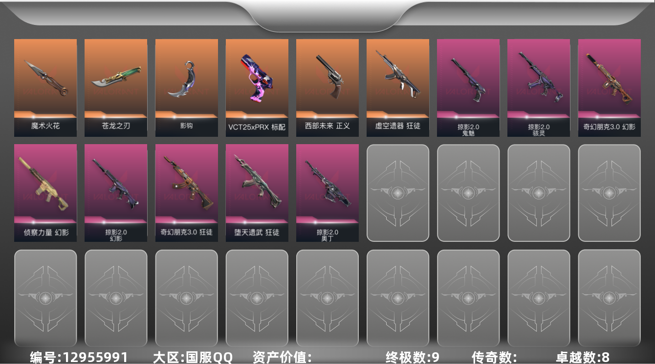[12955991]【套装】:掠影//2.0套装 【英雄】:幻棱,炼狱,暮蝶,壹决,铁臂,捷风,幽影,不死鸟,贤者,猎枭,芮娜,奇乐,尚勃勒,星礈,钢锁 【近战 武器】:近战武器-魔术火花,近战武器-影钩,近战武器-5周年//公测重制版 苍龙之刃,近战武器-魔术火花 【狂徒】:狂徒-虚空遗器,狂徒-堕天遗武,狂徒-奇幻朋克//3.0 【幻影】:幻影-侦察力量,幻影-掠影//2.0,幻影-奇幻朋克//3.0 【奥丁】:奥丁-掠影//2.0 【骇灵】:骇灵-掠影//2.0 【VCT手枪】:标配-VCT25 x PRX 【正义】:正义-西部未来 【鬼魅】:鬼魅-掠影//2.0 【短炮】:短炮-好搭档 【卡面】:Clutch 卡面,无畏契约GO!第一卷:贤者 卡面,代号红色 卡面,新兵报到 卡面,V契约 卡面,无畏契约 卡面 【喷漆】:胜利属于无畏契约 喷漆,GLHF 喷漆,无畏契约 喷漆 【挂饰】:无畏契约GO!第一卷 零 挂饰,无畏契约 纪念币 挂饰