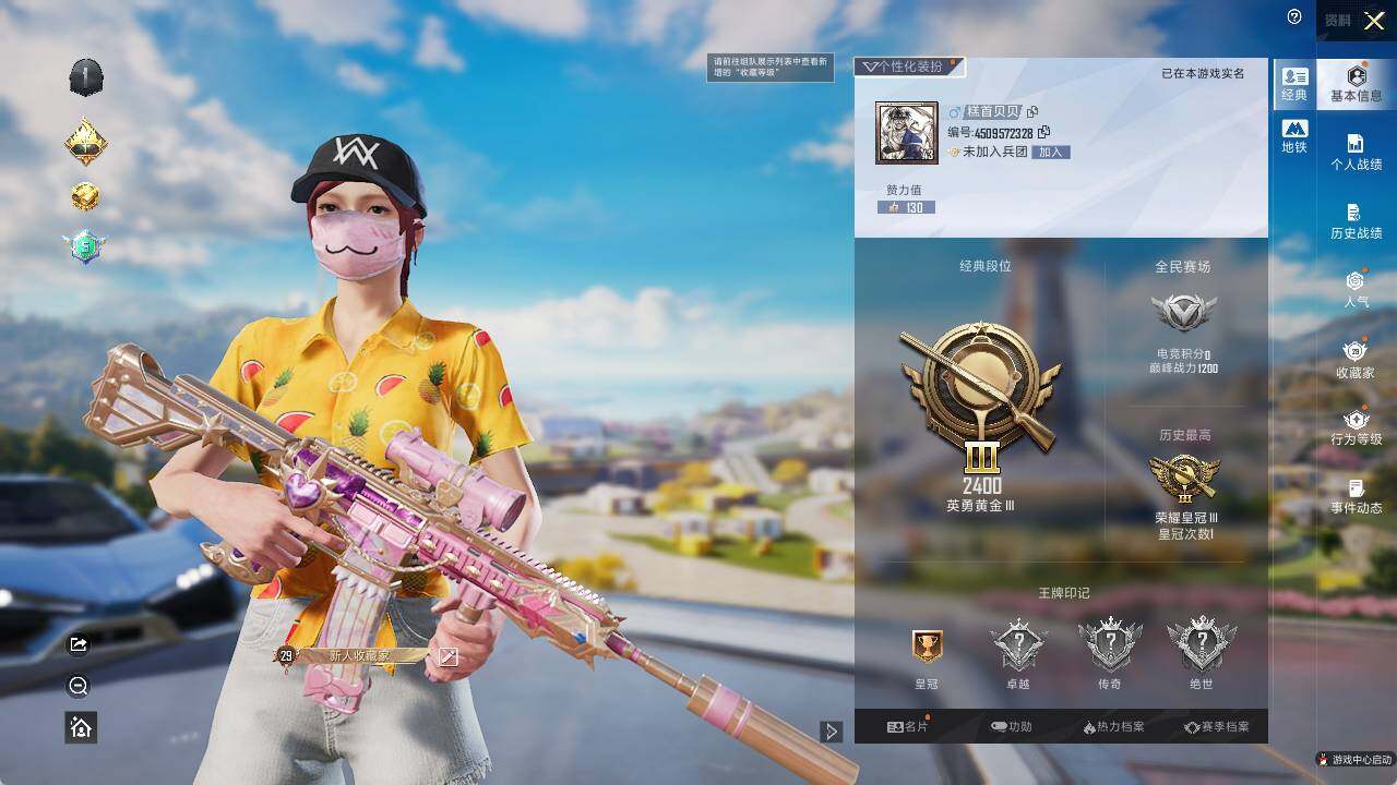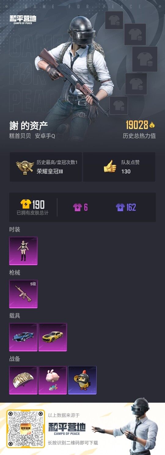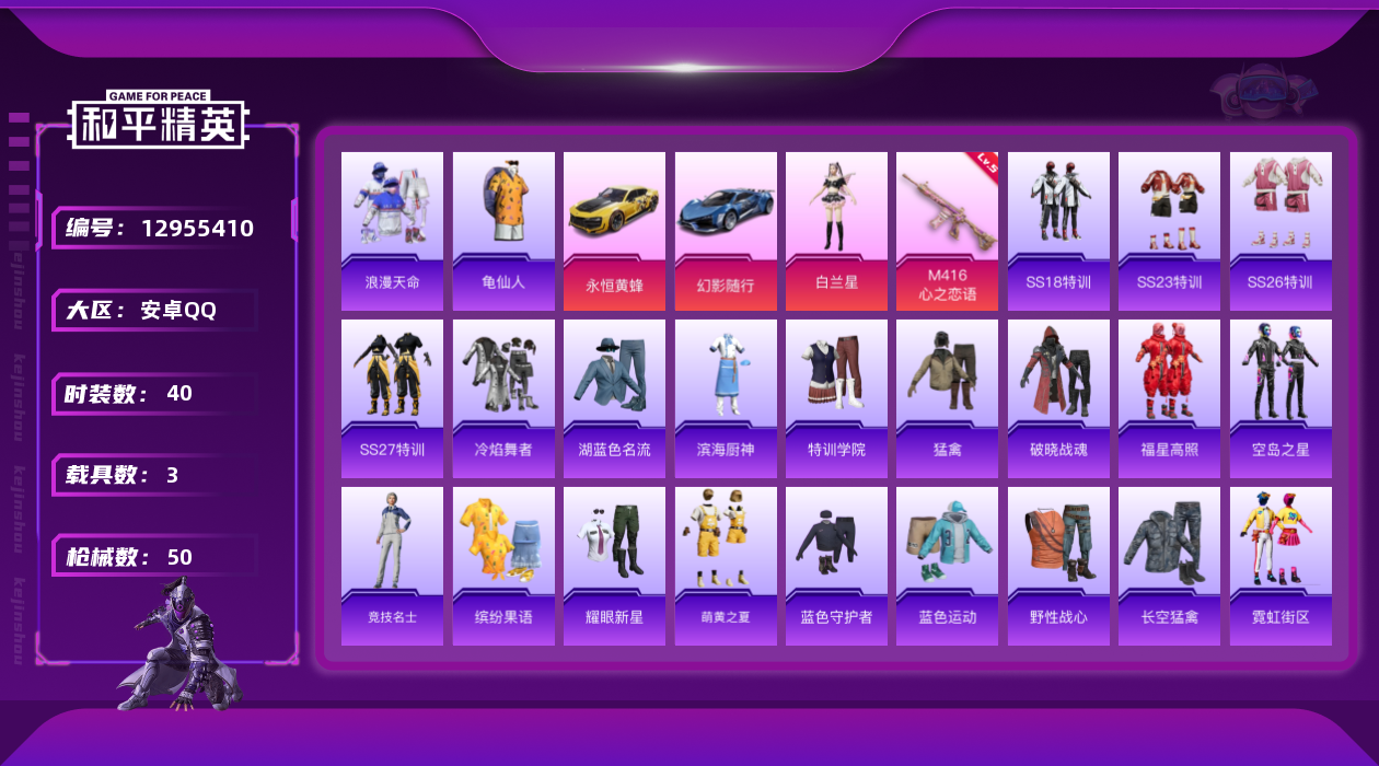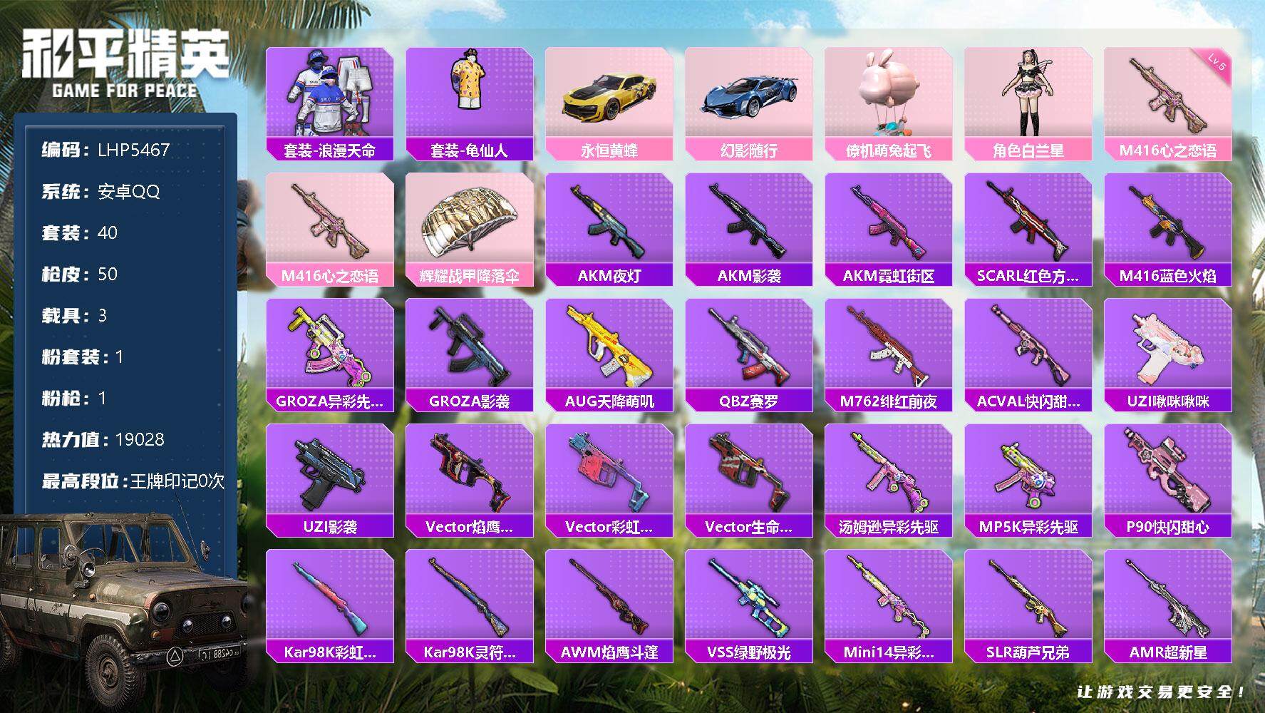 [12955410]安卓 手Q-1粉装-1特效枪-3载具-1.9w热力值-1王牌印记-40套装-50枪皮【热门品类】:套装-浪漫天命,套装-龟仙人【粉色载具】:永恒黄蜂,幻影随行,僚机-萌兔起飞【粉色套装】:角色-白兰星【粉色枪皮等级】:M416-心之恋语(五级)