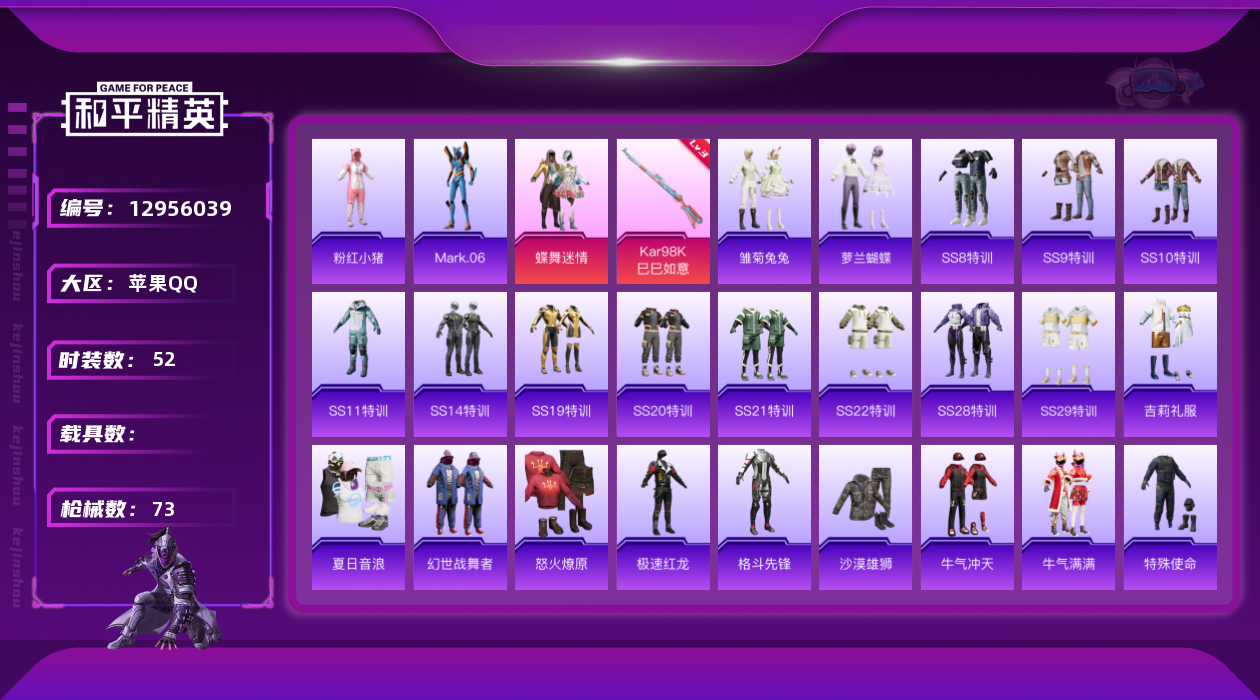 [12956039]苹果 手Q-1粉装-1特效枪-1.9w热力值-1王牌印记-52套装-73枪皮【热门品类】:套装-粉红小猪,角色-Mark.06【粉色套装】:粉装-蝶舞迷情【粉色枪皮等级】:Kar98K-巳巳如意(三级)