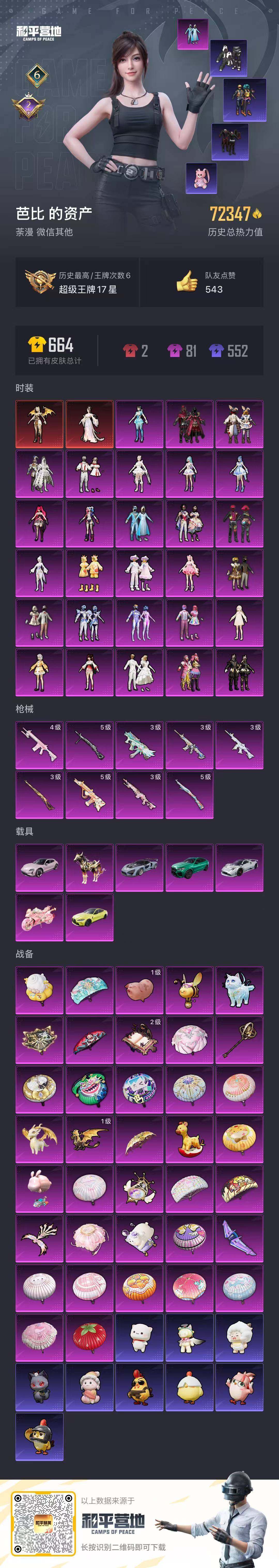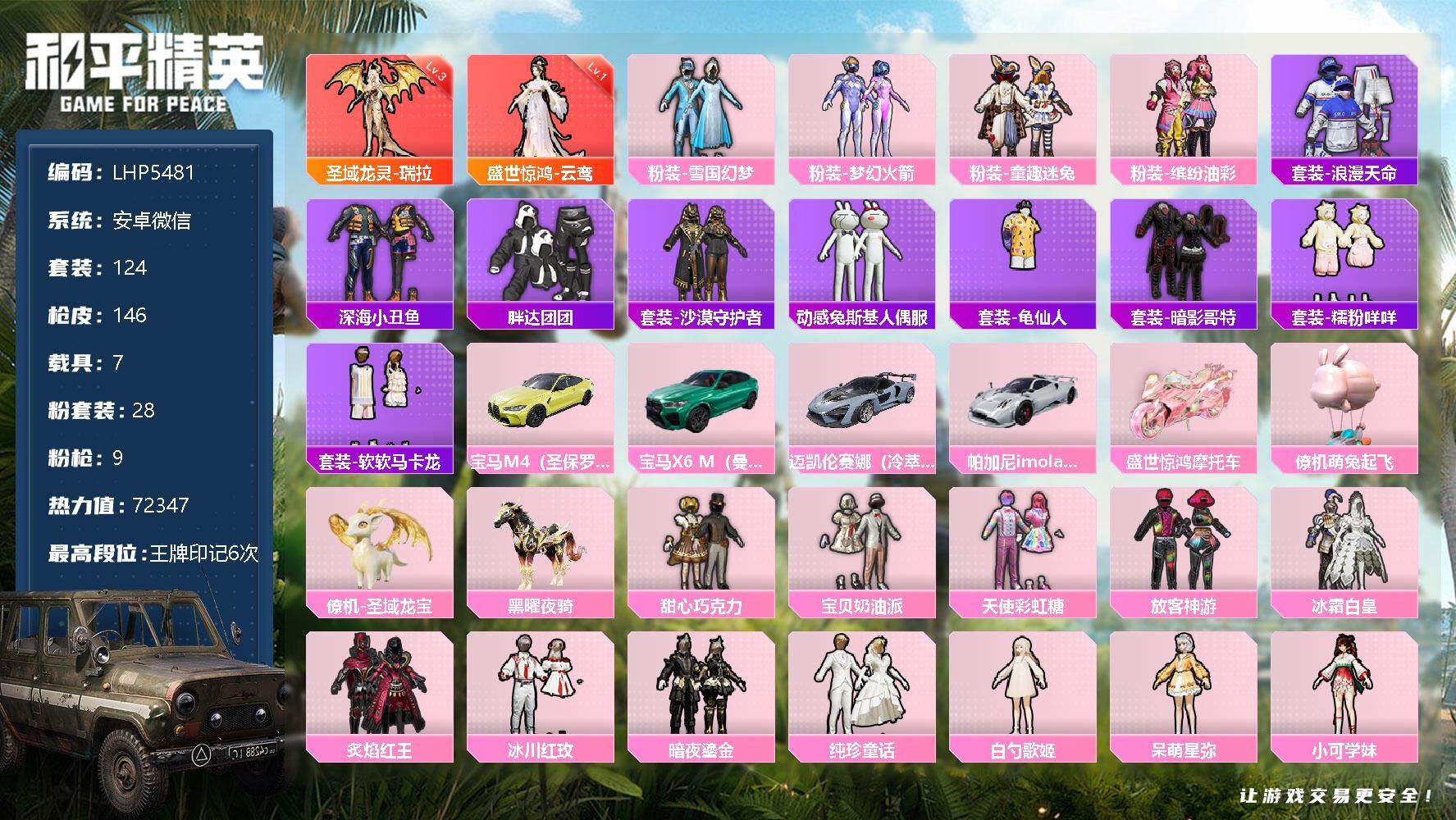 [12955604]安卓 微信-2神装-28粉装-9特效枪-7载具-11粉色飞行器-72347热力值-6王牌印记-124套装-146枪皮【红色神装等级】:圣域龙灵-瑞拉(三级),盛世惊鸿-云鸾(一级)【红色角色神装】:圣域龙灵-瑞拉,盛世惊鸿-云鸾【热门品类】:粉装-雪国幻梦,粉装-梦幻火箭,粉装-童趣迷兔,粉装-缤纷油彩,套装-浪漫天命,套装-深海小丑鱼,套装-胖达团团,套装-沙漠守护者,套装-动感兔斯基人偶服,套装-龟仙人,套装-暗影哥特,套装-糯粉咩咩,套装-软软马卡龙【粉色载具】:宝马M4(圣保罗黄),宝马X6 M(曼岛绿),迈凯伦塞纳(冷萃蓝),帕加尼imola(艺术银),盛世惊鸿摩托车,僚机-萌兔起飞,僚机-圣域龙宝,黑曜夜骑【粉色套装】:粉装-甜心巧克力,粉装-宝贝奶油派,粉装-天使彩虹糖,粉装-雪国幻梦,粉装-梦幻火箭,粉装-缤纷油彩,粉装-放客神游,粉装-冰霜白皇,粉装-童趣迷兔,粉装-炙焰红王,粉装-冰川红玫,粉装-暗夜鎏金,粉装-纯珍童话,角色-白勺歌姬,角色-呆萌星弥,角色-小可学妹,粉装-双星鱼跃,角色-鸢尾晶梦,角色-千金淑猫,角色-女娲灵识,角色-樱桃泡泡,粉装-戏水时光,粉装-星月云朵,粉装-星穹咏叹调,角色-狂魅哈莉,角色-绯穹魔姬,角色-奇迹舞步 美琪,角色-异瞳寒姬【粉色枪皮等级】:M416-女娲灵识(三级),M416-灵猫魔法师(三级),AUG-暖羊咩咩(五级),JS9-奇迹舞步(三级),Kar98K-巳巳如意(五级),Kar98K-圣域龙灵(三级),Mk14-盛世惊鸿(三级),M417-第五大道(四级),DP-28-豹影疾电(五级)【粉色枪皮】:M416-女娲灵识,M416-灵猫魔法师,AUG-暖羊咩咩,JS9-奇迹舞步,Kar98K-巳巳如意,Kar98K-圣域龙灵,Mk14-盛世惊鸿,M417-第五大道,DP-28-豹影疾电【粉色飞行器】:酣梦熊熊飞行器,梦幻火箭飞行器,凤舞九天飞行器,彩虹独角兽飞行器,戏水时光飞行器,圣域金龙飞行器,时光之誓飞行器,绯月迷踪飞行器,灵猫魔法师飞行器,飞天猪飞行器