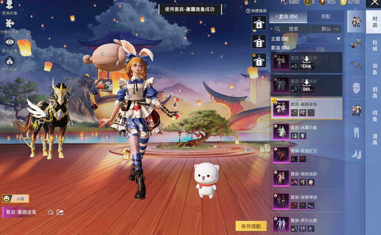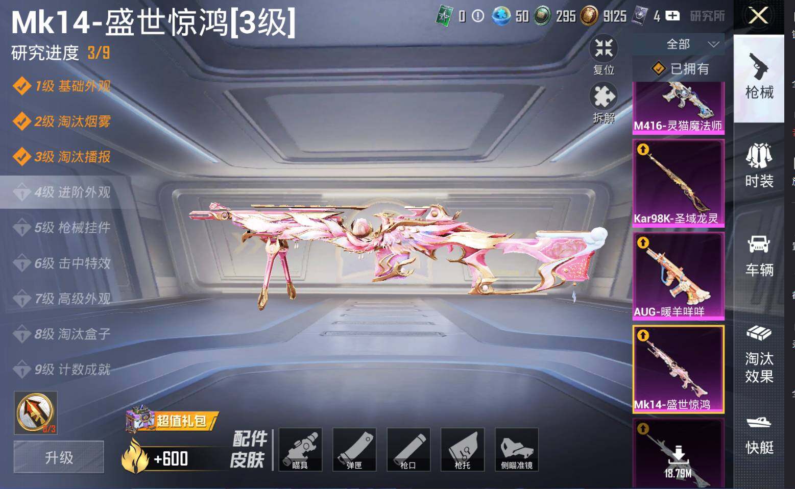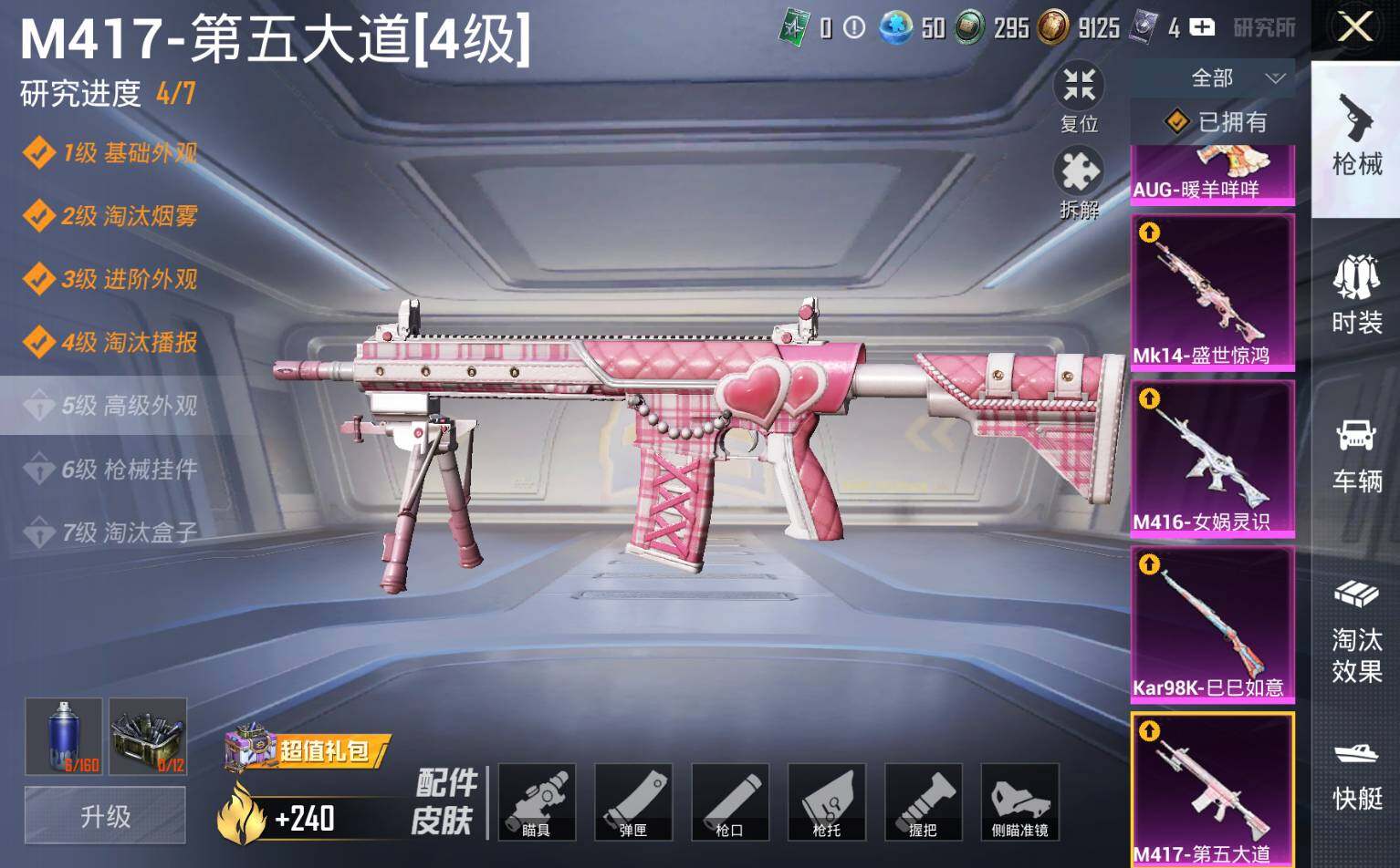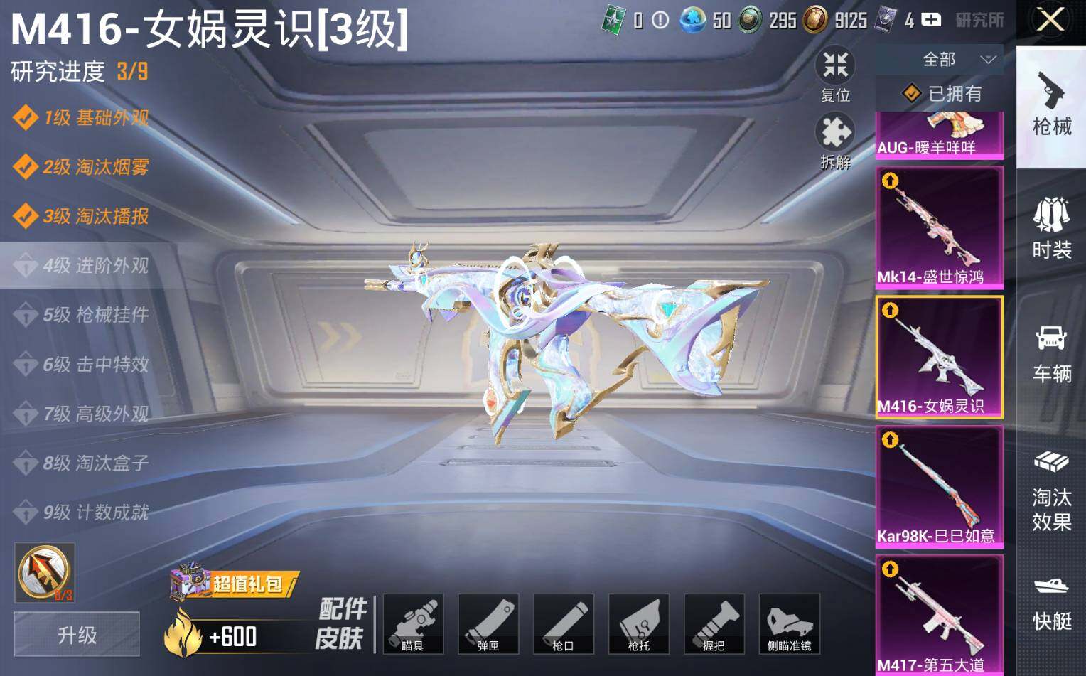 M416-女娲灵识,AUG-暖羊咩咩,Kar98K-巳巳如意,Kar98K-圣域龙灵,Mk14-盛世惊鸿,M417-第五大道
