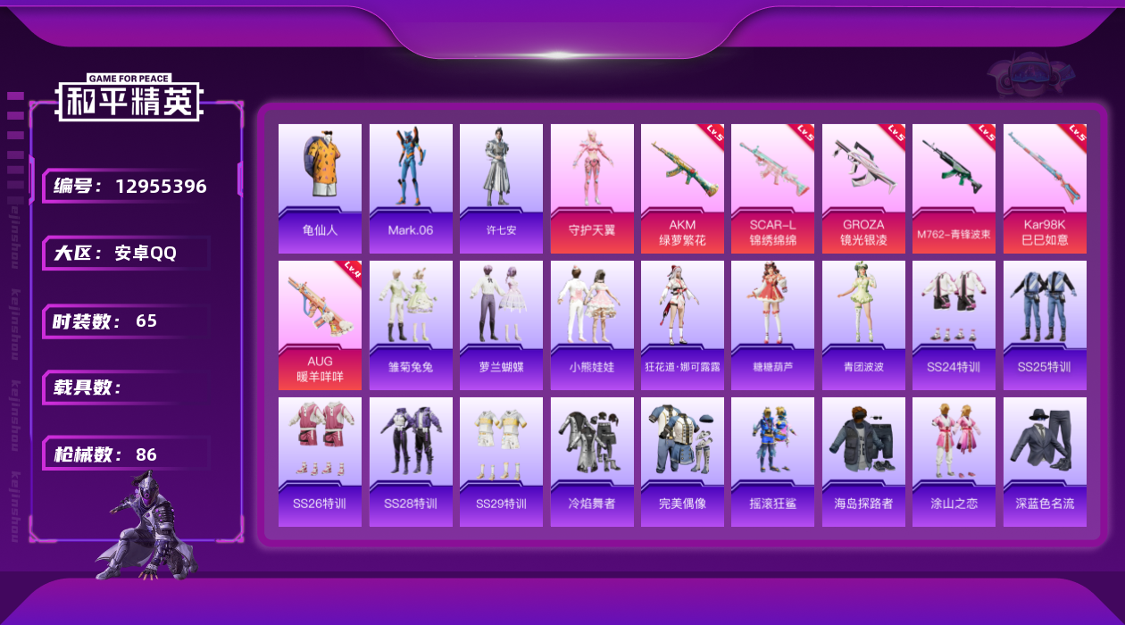 - [13067274]安卓 手Q-2粉装-3特效枪-1载具-1粉色飞行器-3.2w热力值-3王牌印记-72套装-86枪皮【热门品类】:粉装-梦幻火箭,套装-奇异狩猎者,角色-军刀雅典娜,套装-星河浪客【粉色载具】:阿斯顿马丁DBS(绿)【粉色套装】:粉装-梦幻火箭,粉装-苍蓝魅影【粉色枪皮等级】:SCAR-L-梦幻火箭(四级),M416-心之恋语(五级),Mini14-荧光虫舞(四级)【粉色飞行器】:梦幻火箭飞行器