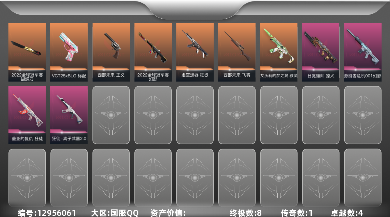 [12956061]【套装】:2022全球冠军赛套装 【英雄】:炼狱,暮蝶,钛狐,壹决,铁臂,捷风,不死鸟,贤者,猎枭,蝰蛇,零,芮娜,奇乐,尚勃勒,霓虹,斯凯,盖可,黑梦 【近战 武器】:近战武器-2022全球冠军赛 蝴蝶刀 【狂徒】:狂徒-虚空遗器,狂徒-盖亚的复仇,狂徒-离子武器//2.0 【幻影】:幻影-2022全球冠军赛,幻影-源能者危机001 【獠犬】:獠犬-日冕雄师 【飞将】:飞将-西部未来 【骇灵】:骇灵-艾沃莉的梦之翼 【VCT手枪】:标配-VCT25 x BLG 【正义】:正义-西部未来 【卡面】:南瓜盛典 卡面,无畏契约GO!第一卷:芮娜 卡面,无畏契约GO!第一卷:零 卡面,《双城之战》金克丝 卡面,夯实根基 卡面,代号红色 卡面,新兵报到 卡面,V契约 卡面,无畏契约 卡面 【喷漆】:霓光四射 喷漆,买装还是存钱 喷漆,关门放狗 喷漆,胜利属于无畏契约 喷漆,GLHF 喷漆,无畏契约 喷漆 【挂饰】:天外飞客 挂饰,红鳞松叶 挂饰,无畏契约 纪念币 挂饰