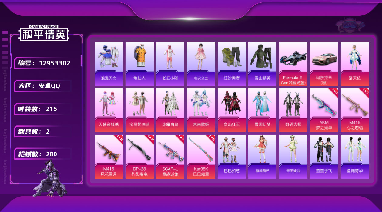 [12953302]素材身法号/绝世印记1【特价急出/详情看图】:安卓 手Q-8粉装-6特效枪-2载具-3粉色飞行器-9w热力值-19王牌印记-215套装-280枪皮【热门品类】:粉装-雪国幻梦,套装-浪漫天命,套装-胖达圆圆,套装-动感兔斯基人偶服,套装-龟仙人,套装-潮萌小黄鸭,套装-粉红小猪【粉色载具】:玛莎拉蒂Ghibli(粉),Formula E Gen2(幽光蓝)【粉色套装】:粉装-数码大师,粉装-宝贝奶油派,粉装-天使彩虹糖,粉装-雪国幻梦,粉装-冰霜白皇,粉装-炙焰红王,角色-洛天依,粉装-未来歌姬【粉色枪皮等级】:AKM-梦之光华(七级),SCAR-L-童趣迷兔(五级),M416-心之恋语(七级),M416-风花雪月(六级),Kar98K-巳巳如意(五级),DP-28-豹影疾电(五级)【粉色飞行器】:星之彼岸飞行器,齐天大圣飞行器