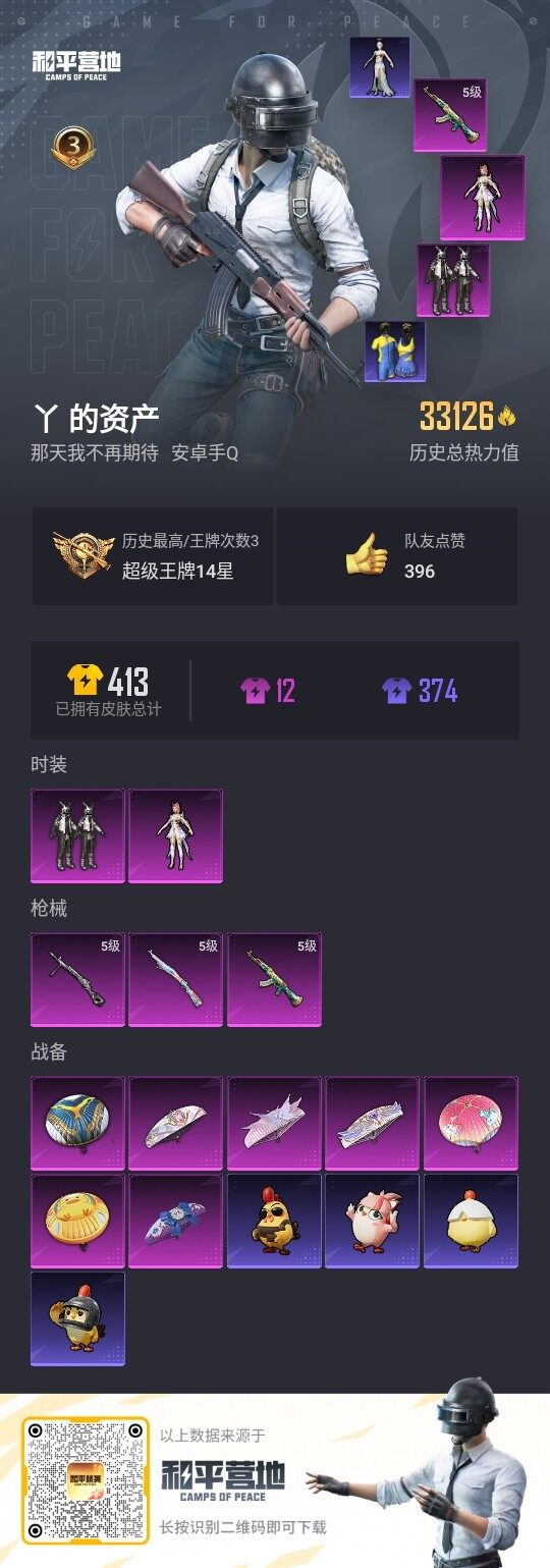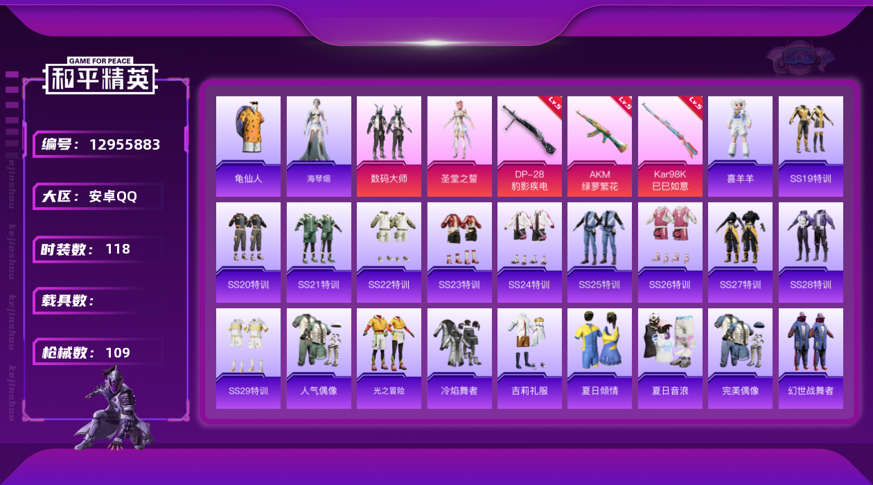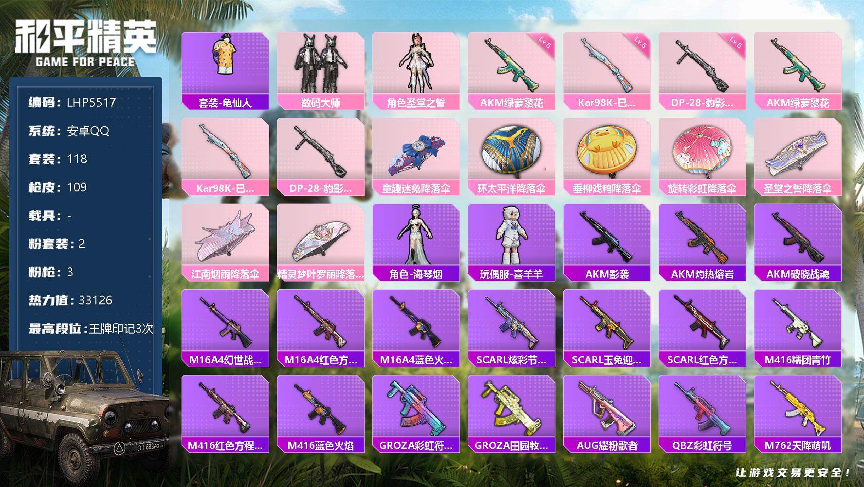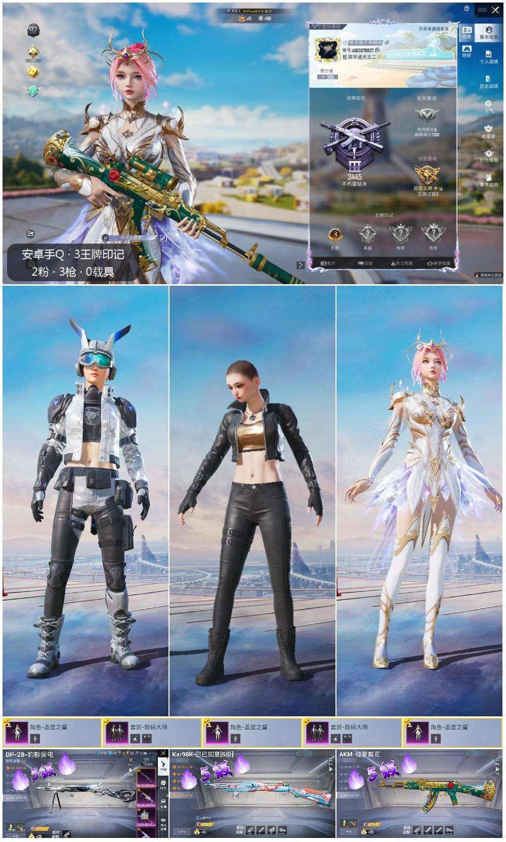 [12955883]地铁满天赋 安卓 手Q-2粉装-3特效枪-3.3w热力值-3王牌印记-118套装-109枪皮【热门品类】:套装-龟仙人【粉色套装】:粉装-数码大师,角色-圣堂之誓【粉色枪皮等级】:AKM-绿萝繁花(五级),Kar98K-巳巳如意(五级),DP-28-豹影疾电(五级)