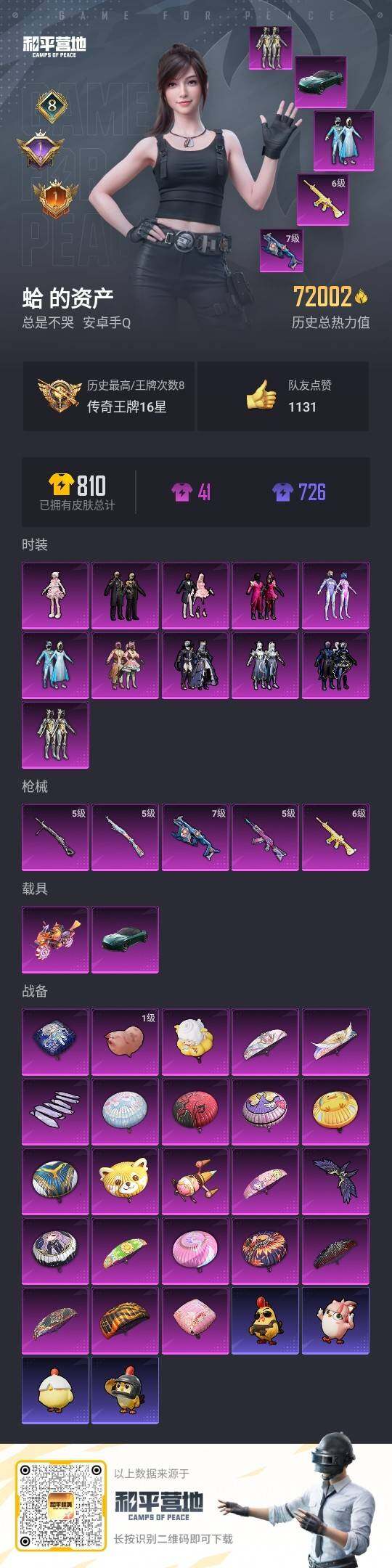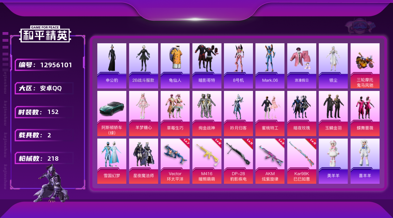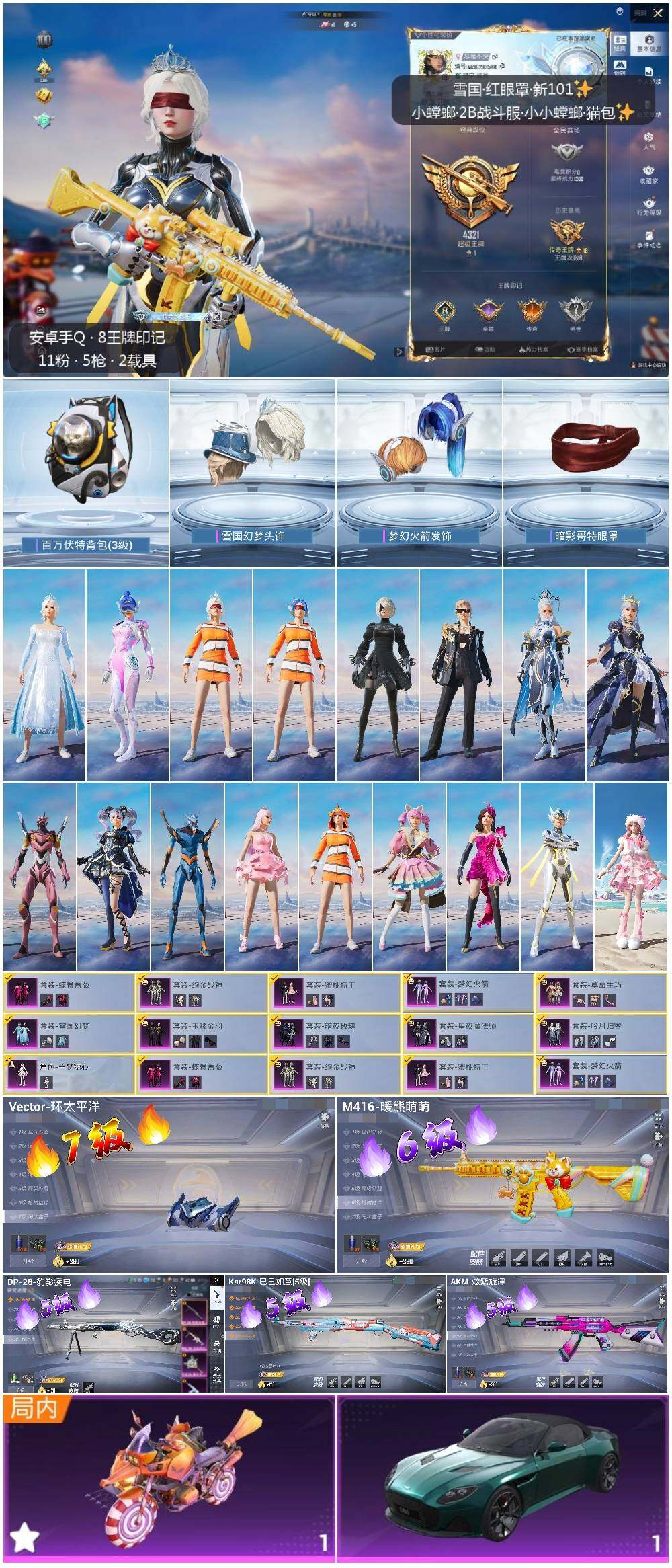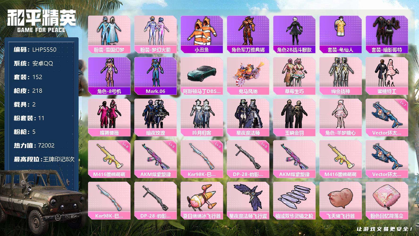 [12956101]素材身法号 安卓 手Q-11粉装-5特效枪-2载具-4粉色飞行器-7.2w热力值-8王牌印记-152套装-218枪皮【热门品类】:粉装-雪国幻梦,粉装-梦幻火箭,套装-小丑鱼,角色-军刀雅典娜,角色-2B战斗服款,套装-龟仙人,套装-暗影哥特,角色-8号机,角色-Mark.06【粉色载具】:阿斯顿马丁DBS(绿),鬼马风驰【粉色套装】:粉装-雪国幻梦,粉装-梦幻火箭,粉装-草莓生巧,粉装-绚金战神,粉装-蜜桃特工,粉装-蝶舞蔷薇,粉装-暗夜玫瑰,粉装-吟月归客,粉装-星夜魔法师,粉装-玉鳞金羽,角色-羊梦糖心【粉色枪皮等级】:AKM-炫紫旋律(五级),M416-暖熊萌萌(六级),Vector-环太平洋(七级),Kar98K-巳巳如意(五级),DP-28-豹影疾电(五级)【粉色飞行器】:夏日绵绵冰飞行器,星夜魔法师飞行翼,镜域双华-灵镜之阶,飞天猪飞行器