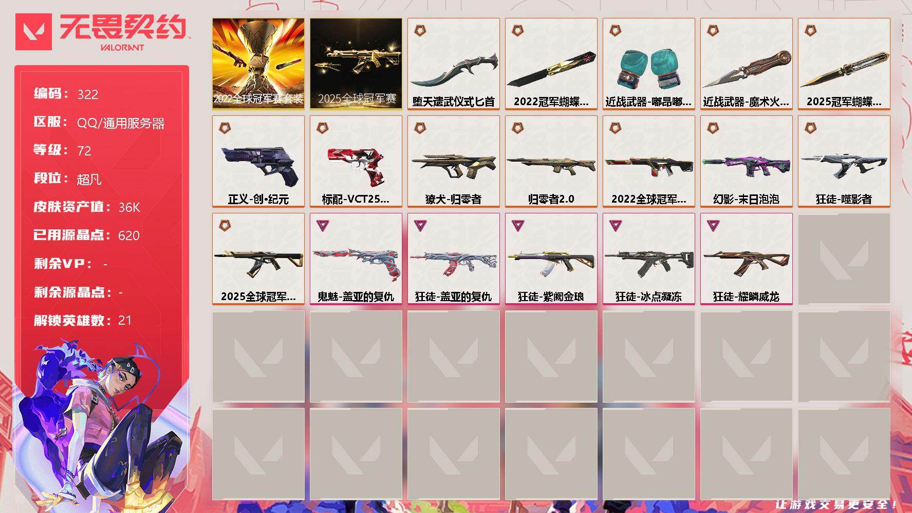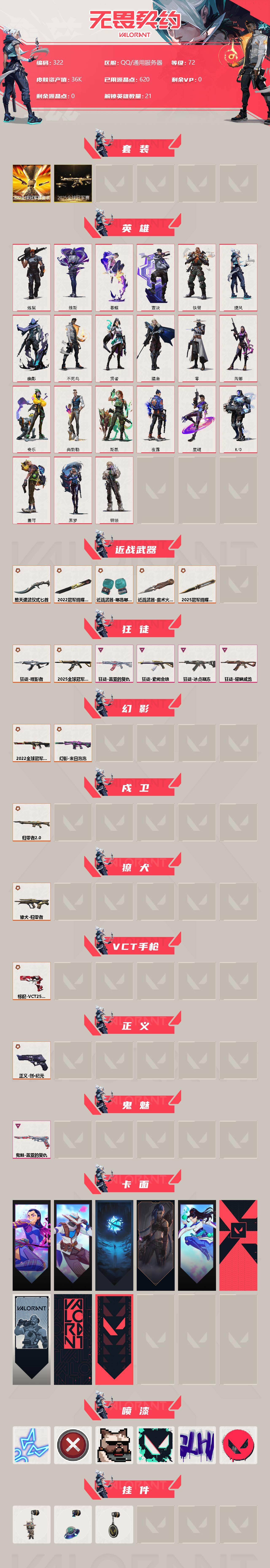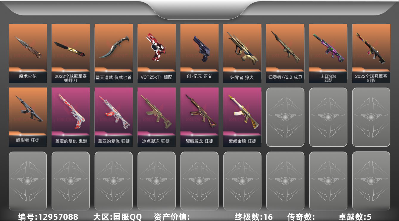 [12957088]【套装】:2025全球冠军赛套装,2022全球冠军赛套装 【英雄】:炼狱,维斯,暮蝶,壹决,铁臂,捷风,幽影,不死鸟,贤者,猎枭,零,芮娜,奇乐,尚勃勒,斯凯,夜露,星礈,K/O,盖可,黑梦,钢锁 【近战 武器】:近战武器-2025全球冠军赛 蝴蝶刀,近战武器-2022全球冠军赛 蝴蝶刀,近战武器-魔术火花,近战武器-嘟昂嘟昂超弹力水球拳套,近战武器-堕天遗武 仪式匕首,近战武器-魔术火花 【狂徒】:狂徒-2025全球冠军赛,狂徒-噬影者,狂徒-冰点凝冻,狂徒-盖亚的复仇,狂徒-耀鳞威龙,狂徒-紫阙金琅 【幻影】:幻影-2022全球冠军赛,幻影-末日泡泡 【戍卫】:戍卫-归零者//2.0 【獠犬】:獠犬-归零者 【VCT手枪】:标配-VCT25 x T1 【正义】:正义-创·纪元 【鬼魅】:鬼魅-盖亚的复仇 【卡面】:无畏契约GO!第一卷:芮娜 卡面,无畏契约GO!第一卷:零 卡面,无垠星环 卡面,《双城之战》金克丝 卡面,无畏契约GO!第一卷:贤者 卡面,代号红色 卡面,新兵报到 卡面,V契约 卡面,无畏契约 卡面 【喷漆】:霓光四射 喷漆,买装还是存钱 喷漆,关门放狗 喷漆,胜利属于无畏契约 喷漆,GLHF 喷漆,无畏契约 喷漆 【挂饰】:无畏契约GO!第一卷 零 挂饰,天外飞客 挂饰,无畏契约 纪念币 挂饰