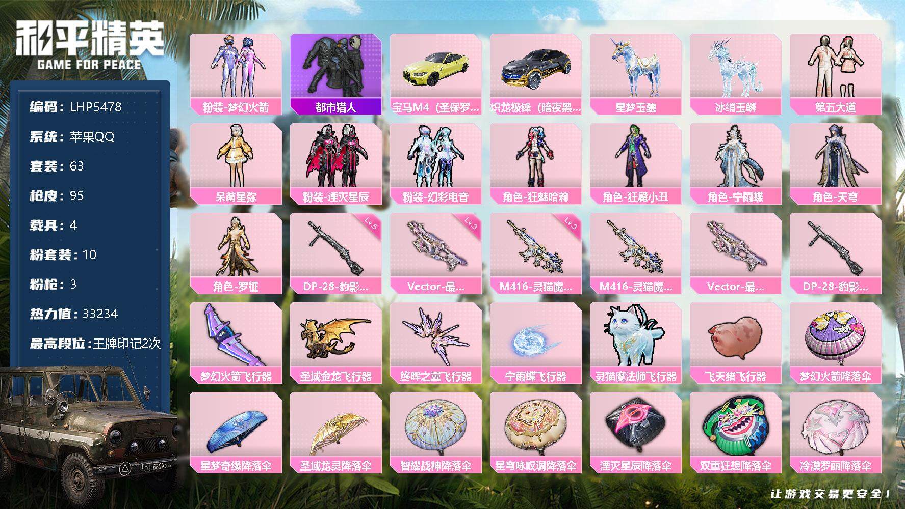 [12955580]素材身法号 苹果 手Q-10粉装-3特效枪-4载具-7粉色飞行器-3.3w热力值-2王牌印记-63套装-95枪皮【热门品类】:粉装-梦幻火箭,套装-都市猎人【粉色载具】:宝马M4(圣保罗黄),炽龙极锋(暗夜黑),星梦玉骢,冰绡玉鳞【粉色套装】:粉装-梦幻火箭,粉装-第五大道,角色-呆萌星弥,粉装-湮灭星辰,粉装-幻彩电音,角色-狂魅哈莉,角色-狂魇小丑,角色-宁雨蝶,角色-天穹,角色-罗征【粉色枪皮等级】:M416-灵猫魔法师(三级),Vector-最终圣卫者(三级),DP-28-豹影疾电(五级)【粉色飞行器】:梦幻火箭飞行器,圣域金龙飞行器,终晖之翼飞行器,宁雨蝶飞行器,灵猫魔法师飞行器,飞天猪飞行器