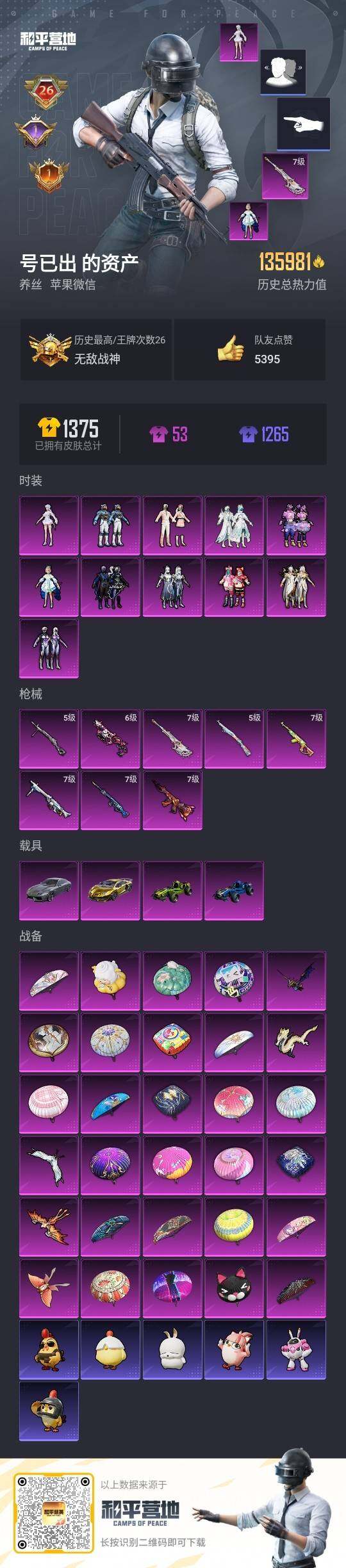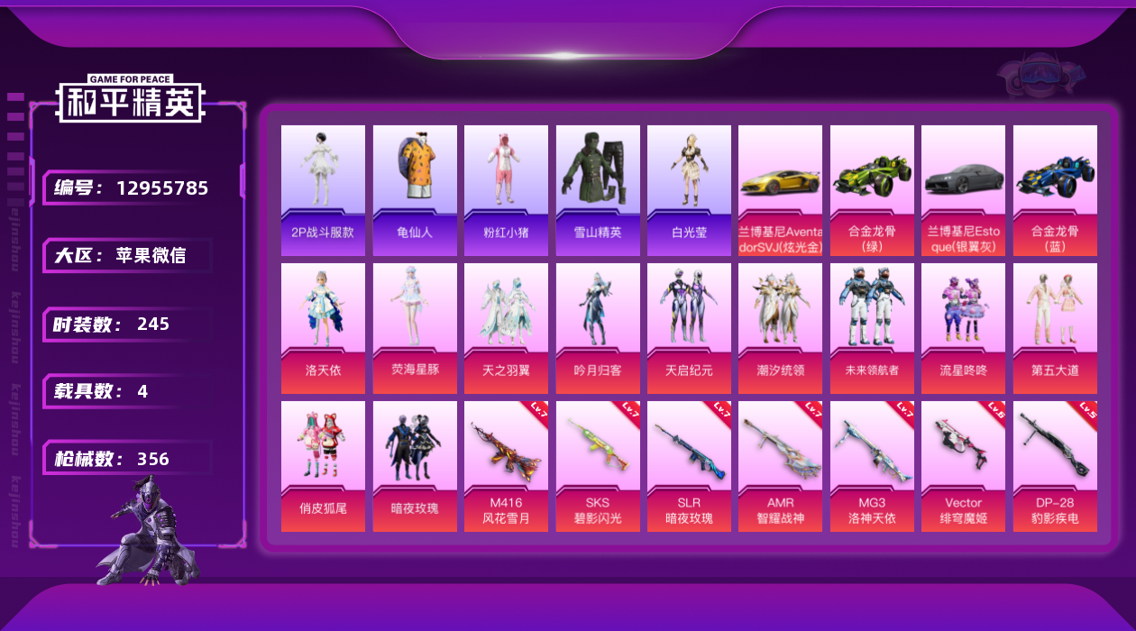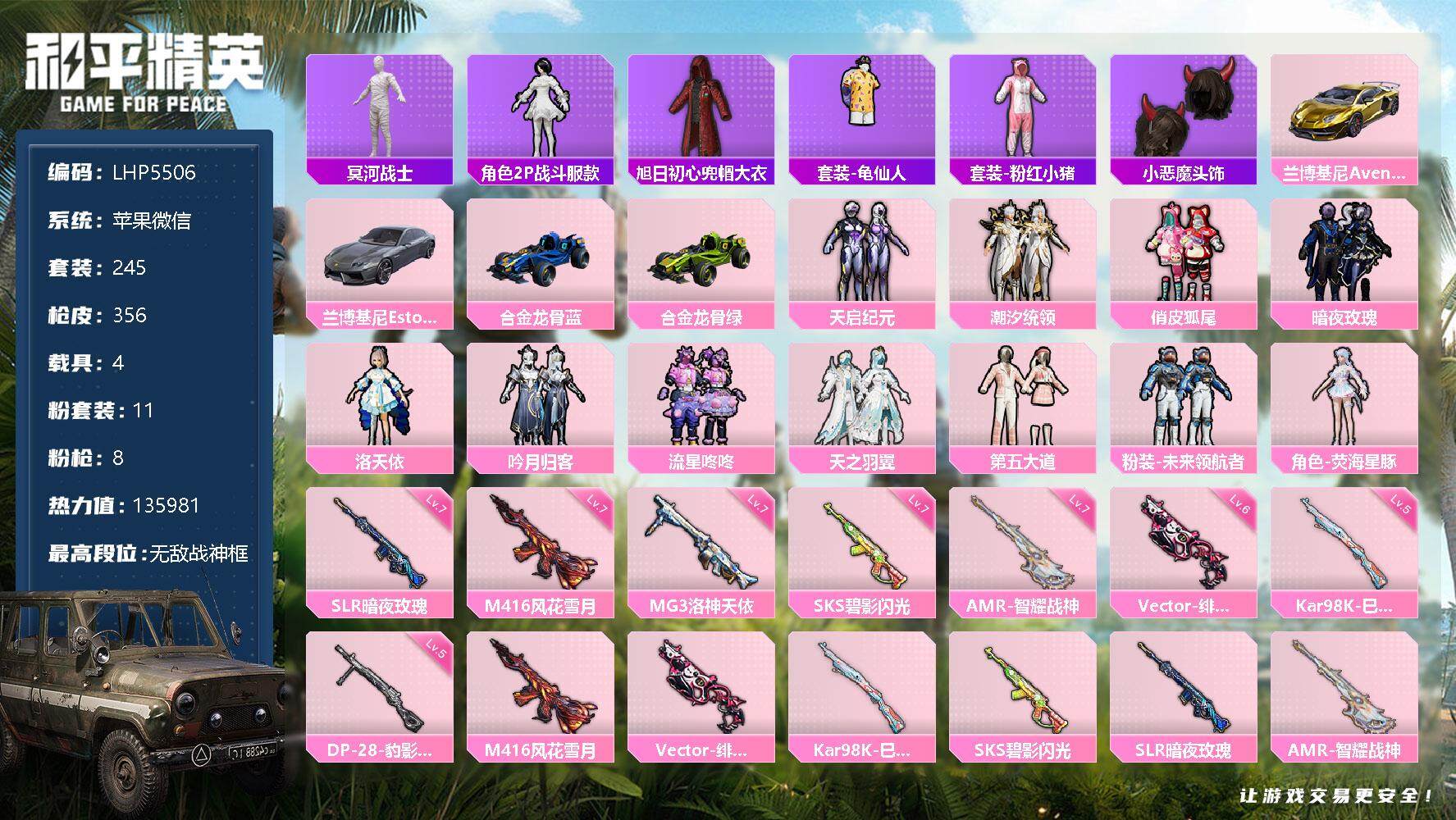 [12955785]素材身法号/无敌战神框/老木乃伊/地铁满天赋 苹果 微信-无敌战神框-11粉装-8特效枪-4载具-5粉色飞行器-13.5w热力值-26王牌印记-245套装-356枪皮【热门品类】:套装-冥河战士,角色-2P战斗服款,旭日初心兜帽大衣,套装-龟仙人,套装-粉红小猪,小恶魔头饰【粉色载具】:兰博基尼Aventador SVJ(炫光金),兰博基尼Estoque(银翼灰),合金龙骨(蓝),合金龙骨(绿)【粉色套装】:粉装-天启纪元,粉装-潮汐统领,粉装-俏皮狐尾,粉装-暗夜玫瑰,角色-洛天依,粉装-吟月归客,粉装-流星咚咚,粉装-天之羽翼,粉装-第五大道,粉装-未来领航者,角色-荧海星豚【粉色枪皮等级】:M416-风花雪月(七级),Vector-绯穹魔姬(六级),Kar98K-巳巳如意(五级),SKS-碧影闪光(七级),SLR-暗夜玫瑰(七级),AMR-智耀战神(七级),DP-28-豹影疾电(五级),MG3-洛神天依(七级)【粉色飞行器】:锦绣火鲤飞行器,风花雪月飞行器,天之羽翼飞行器,黄族统领飞行器,繁龙极客飞行器