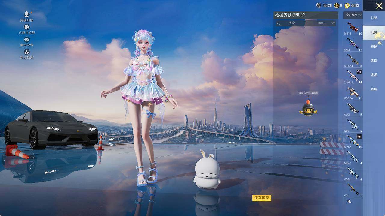 M416-风花雪月,Kar98K-巳巳如意,SKS-碧影闪光,SLR-暗夜玫瑰,MG3-洛神天依