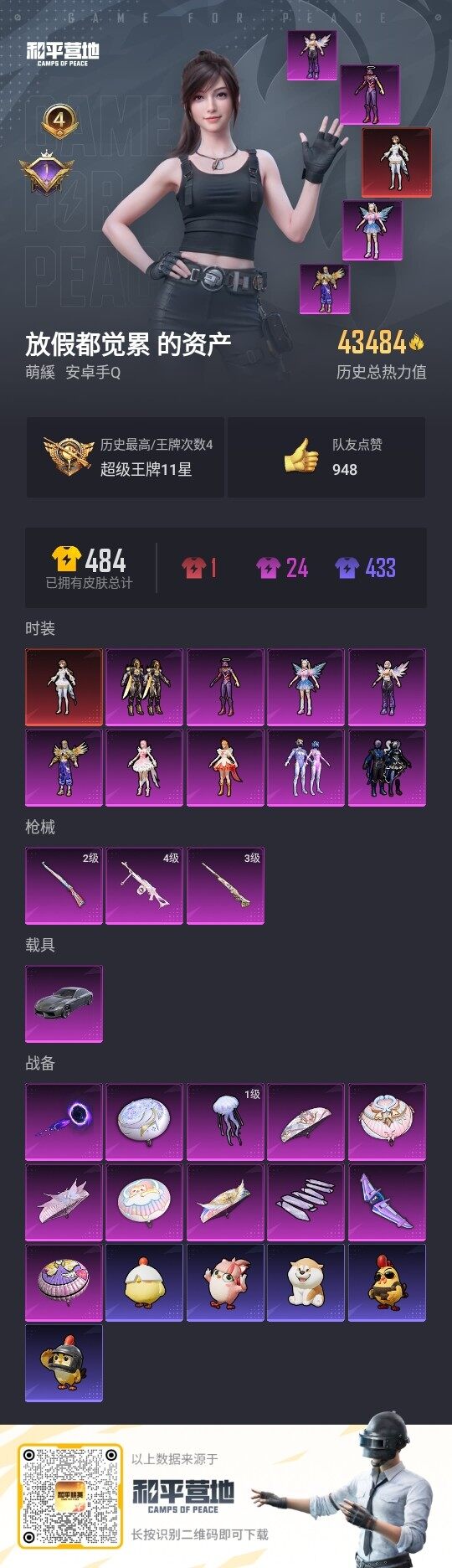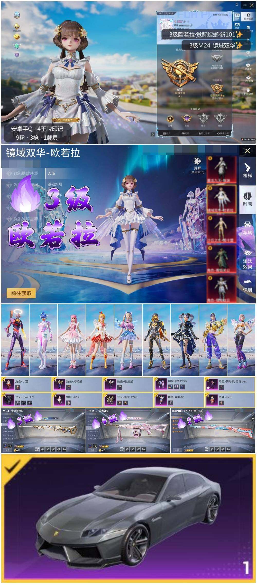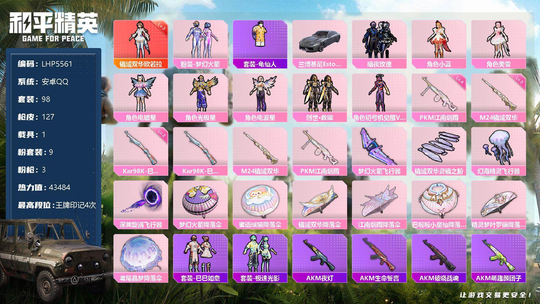 [12956171]素材身法号 安卓 手Q-1神装-9粉装-3特效枪-1载具-4粉色飞行器-4.3w热力值-4王牌印记-98套装-127枪皮【红色神装等级】:镜域双华-欧若拉(三级)【热门品类】:粉装-梦幻火箭,套装-龟仙人【粉色载具】:兰博基尼Estoque(银翼灰)【粉色套装】:粉装-梦幻火箭,粉装-暗夜玫瑰,角色-小蓝,角色-美雪,角色-电磁星,角色-光极星,角色-电波星,套装-创世·救赎,角色-初号机 觉醒Ver.【粉色枪皮等级】:Kar98K-巳巳如意(二级),M24-镜域双华(三级),PKM-江南烟雨(四级)【粉色飞行器】:梦幻火箭飞行器,镜域双华-灵镜之阶,幻海精灵飞行器,深渊漩涡飞行器