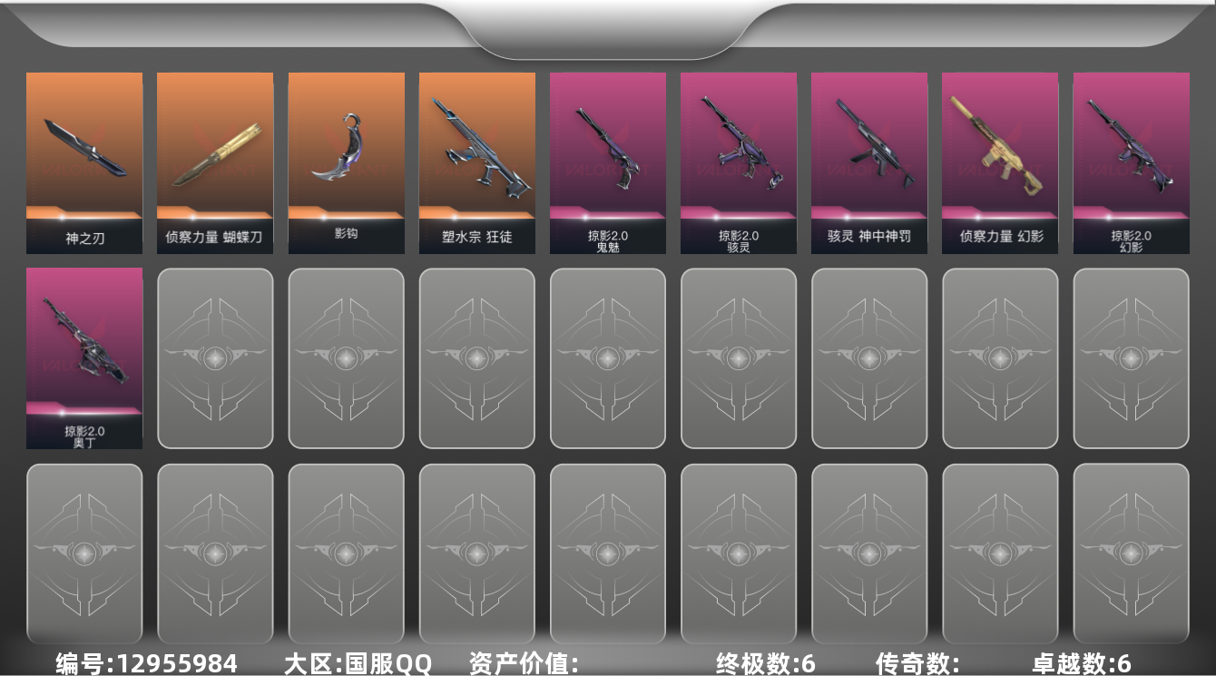 [12955984]【套装】:掠影//2.0套装 【英雄】:炼狱,维斯,暮蝶,壹决,捷风,雷兹,幽影,不死鸟,贤者,猎枭,芮娜,奇乐,尚勃勒,夜露,盖可,黑梦 【近战 武器】:近战武器-影钩,近战武器-神之刃,近战武器-侦察力量 蝴蝶刀 【狂徒】:狂徒-塑水宗 【幻影】:幻影-侦察力量,幻影-掠影//2.0 【奥丁】:奥丁-掠影//2.0 【骇灵】:骇灵-神中神罚,骇灵-掠影//2.0 【鬼魅】:鬼魅-掠影//2.0 【卡面】:红鳞松叶 卡面,无畏契约GO!第一卷:零 卡面,《双城之战》金克丝 卡面,暗枪 卡面,代号红色 卡面,新兵报到 卡面,V契约 卡面,无畏契约 卡面 【喷漆】:情绪控制 喷漆,买装还是存钱 喷漆,胜利属于无畏契约 喷漆,GLHF 喷漆,无畏契约 喷漆 【挂饰】:无畏契约 纪念币 挂饰