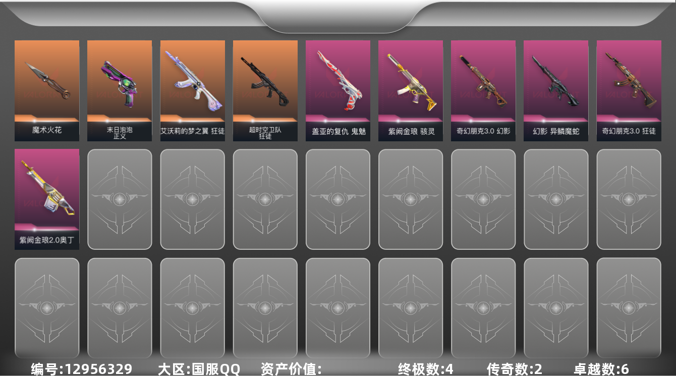 - [12260678]10橙皮 8紫皮 66皮肤 26英雄 97卡面 725已用源晶 黄金 优质装备:幻影-2024全球冠军赛,狂徒-紫阙金琅,狂徒-盖亚的复仇,狂徒-偃月苍龙,幻影-侦察力量,正义-千灵华绽,冥驹-起源,威龙之刃,夜刃诡镰,荒土机兵热能刀,神圣领域 战刀,影钩 套装:掠影2.0套装 佩枪皮肤:鬼魅-掠影2.0,正义-西部未来,标配-VCTxLEV 冲锋枪皮肤:骇灵-掠影2.0 步枪皮肤:幻影-掠影2.0 机枪皮肤:奥丁-掠影2.0