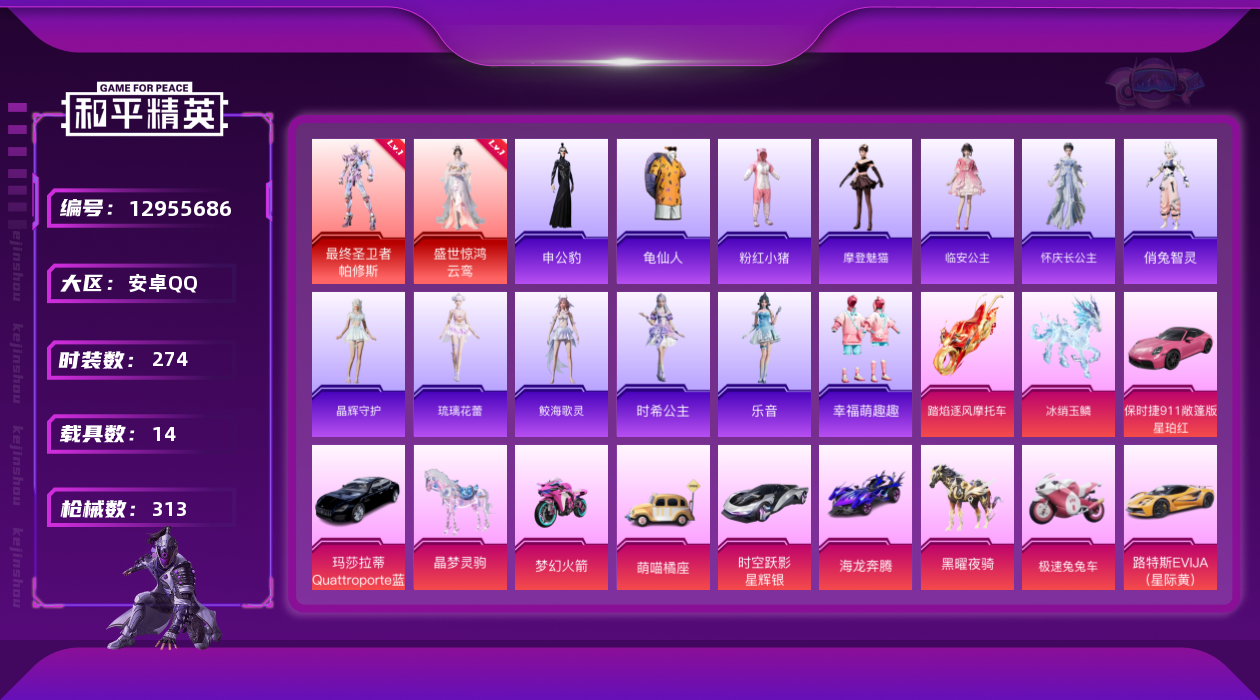 [12955686]素材身法号/扭蛋碎片784 安卓 手Q-2神装-37粉装-10特效枪-14载具-19粉色飞行器-13.3w热力值-12王牌印记-274套装-313枪皮【红色神装等级】:最终圣卫者-帕修斯(一级),盛世惊鸿-云鸾(一级)【热门品类】:粉装-梦幻火箭,粉装-童趣迷兔,粉装-缤纷油彩,套装-忍者信条,套装-龟仙人,套装-粉红小猪【粉色载具】:路特斯EVIJA(星际黄),玛莎拉蒂Quattroporte(夜幕蓝),时空跃影(星辉银),保时捷911 敞篷版(星珀红),海龙奔腾,萌喵橘座,双人摩托-梦幻火箭,极速兔兔车,踏焰逐风摩托车,僚机-萌兔起飞,僚机-圣域龙宝,晶梦灵驹,黑曜夜骑,冰绡玉鳞【粉色套装】:粉装-甜心巧克力,粉装-宝贝奶油派,粉装-天使彩虹糖,粉装-梦幻火箭,粉装-缤纷油彩,粉装-新星烈龙,粉装-冰霜白皇,粉装-童趣迷兔,粉装-炙焰红王,粉装-香水柠檬,粉装-蜜桃特工,粉装-暗星紫秘,粉装-灵感创作师,粉装-霓裳武神,粉装-鸾凤武仙,粉装-朗月武圣,粉装-彩虹甜喵,蜀山剑侠-李逍遥,粉装-旋转彩虹,粉装-冰川粉黛,粉装-冰川幽秘,粉装-冰川红玫,角色-小可学妹,角色-鸢尾晶梦,角色-星梦奇缘,角色-千金淑猫,角色-女娲灵识,角色-晶梦幻蝶,角色-樱桃泡泡,粉装-戏水时光,粉装-幻彩电音,角色-罗征,角色-荧海星豚,角色-奇迹舞步 美雪,角色-花灵,角色-羊梦糖心【粉色枪皮等级】:M416-灵猫魔法师(三级),GROZA-香水柠檬(七级),AUG-暖羊咩咩(三级),汤姆逊-热量炸弹(五级),Kar98K-巳巳如意(五级),Kar98K-圣域龙灵(一级),Mk14-盛世惊鸿(三级),Mk14-樱桃泡泡(一级),M249-彩虹甜喵(五级),DP-28-豹影疾电(一级)【粉色飞行器】:酣梦熊熊飞行器,梦幻火箭飞行器,灵感创作师飞行器,翩跹演武飞行器,仙剑飞行器,凤舞九天飞行器,万象金身飞行器,幻梦之森飞行器,彩虹独角兽飞行器,戏水时光飞行器,星月云朵飞行器,圣域金龙飞行器,终晖之翼飞行器,绯月迷踪飞行器,智趣喵喵飞行器,灵猫魔法师飞行器,飞天猪飞行器,灵珠游龙飞行器