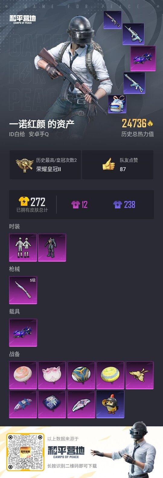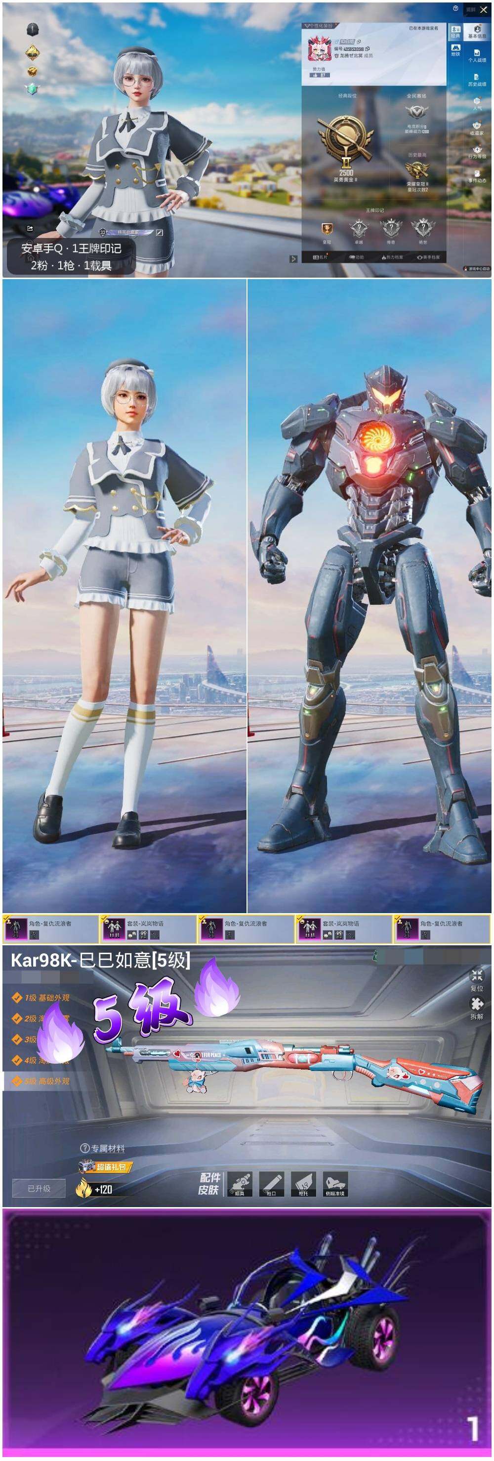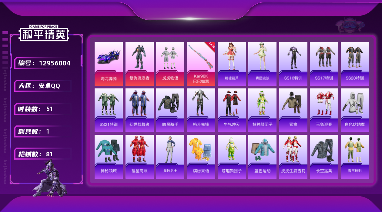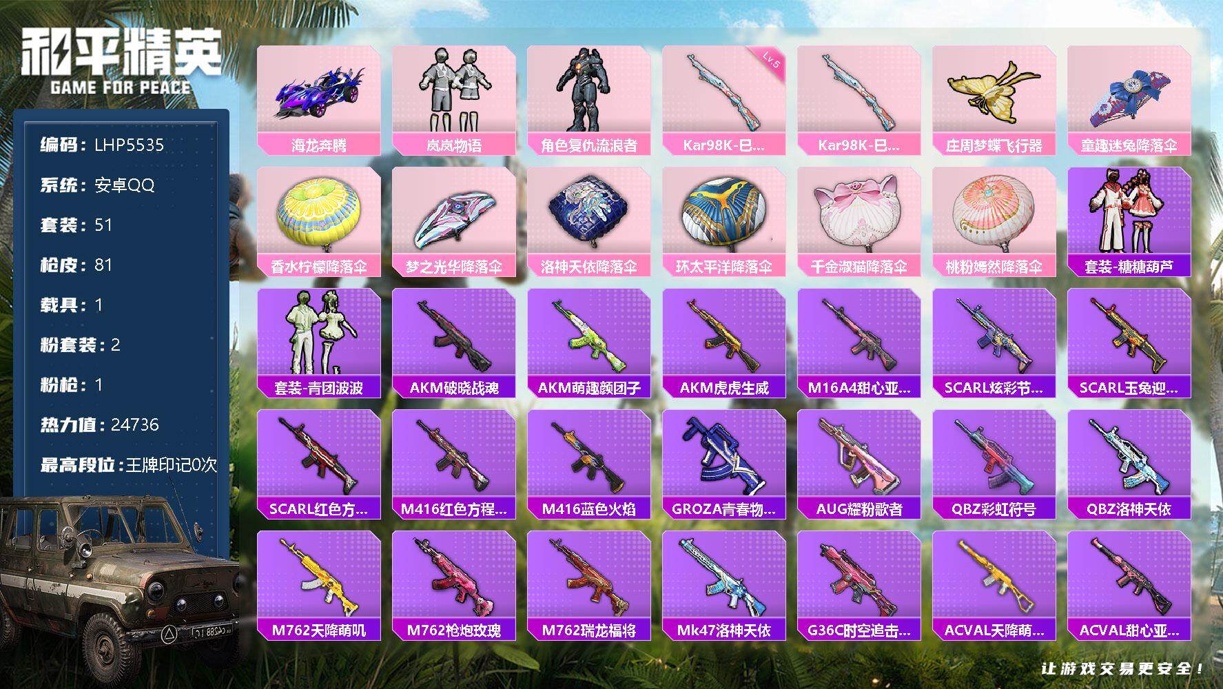 [12956004]安卓 手Q-2粉装-1特效枪-1载具-1粉色飞行器-2.4w热力值-1王牌印记-51套装-81枪皮【粉色载具】:海龙奔腾【粉色套装】:粉装-岚岚物语,角色-复仇流浪者【粉色枪皮等级】:Kar98K-巳巳如意(五级)【粉色飞行器】:庄周梦蝶飞行器