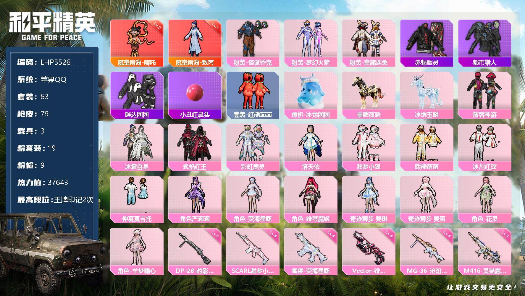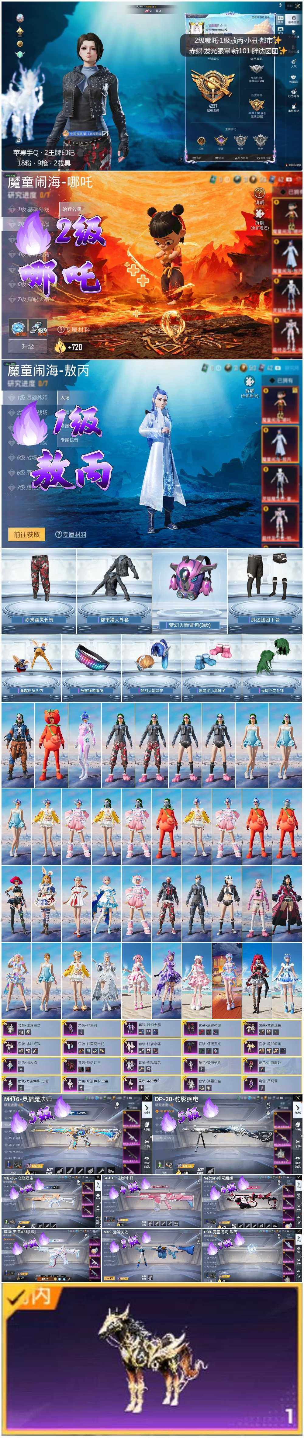 [12955963]素材身法号 苹果 手Q-2神装-19粉装-9特效枪-3载具-3粉色飞行器-3.7w热力值-2王牌印记-63套装-79枪皮【红色神装等级】:魔童闹海-敖丙(一级),魔童闹海-哪吒(二级)【热门品类】:粉装-怪诞乔克,粉装-梦幻火箭,粉装-童趣迷兔,套装-赤蝎幽灵,套装-都市猎人,套装-胖达团团,小丑红鼻头,套装-红熊茄茄【粉色载具】:僚机-冰龙团团,黑曜夜骑,冰绡玉鳞【粉色套装】:粉装-怪诞乔克,粉装-梦幻火箭,粉装-放客神游,粉装-冰霜白皇,粉装-童趣迷兔,粉装-炙焰红王,粉装-彩虹鹿灵,角色-洛天依,粉装-甜梦小狐,粉装-暖熊萌萌,粉装-冰川红玫,粉装-仲夏莫吉托,角色-严莉莉,角色-荧海星豚,角色-绯穹魔姬,角色-奇迹舞步 美琪,角色-奇迹舞步 美雪,角色-花灵,角色-羊梦糖心【粉色枪皮等级】:SCAR-L-甜梦小狐(四级),M416-灵猫魔法师(三级),蜜獾-荧海星豚(四级),Vector-绯穹魔姬(四级),P90-魔童闹海 敖丙(二级),DP-28-豹影疾电(五级),MG3-洛神天依(二级),MG-36-沧焰双生(四级),平底锅-喜羊羊与灰太狼(三级)【粉色飞行器】:灵猫魔法师飞行器,灵珠游龙飞行器