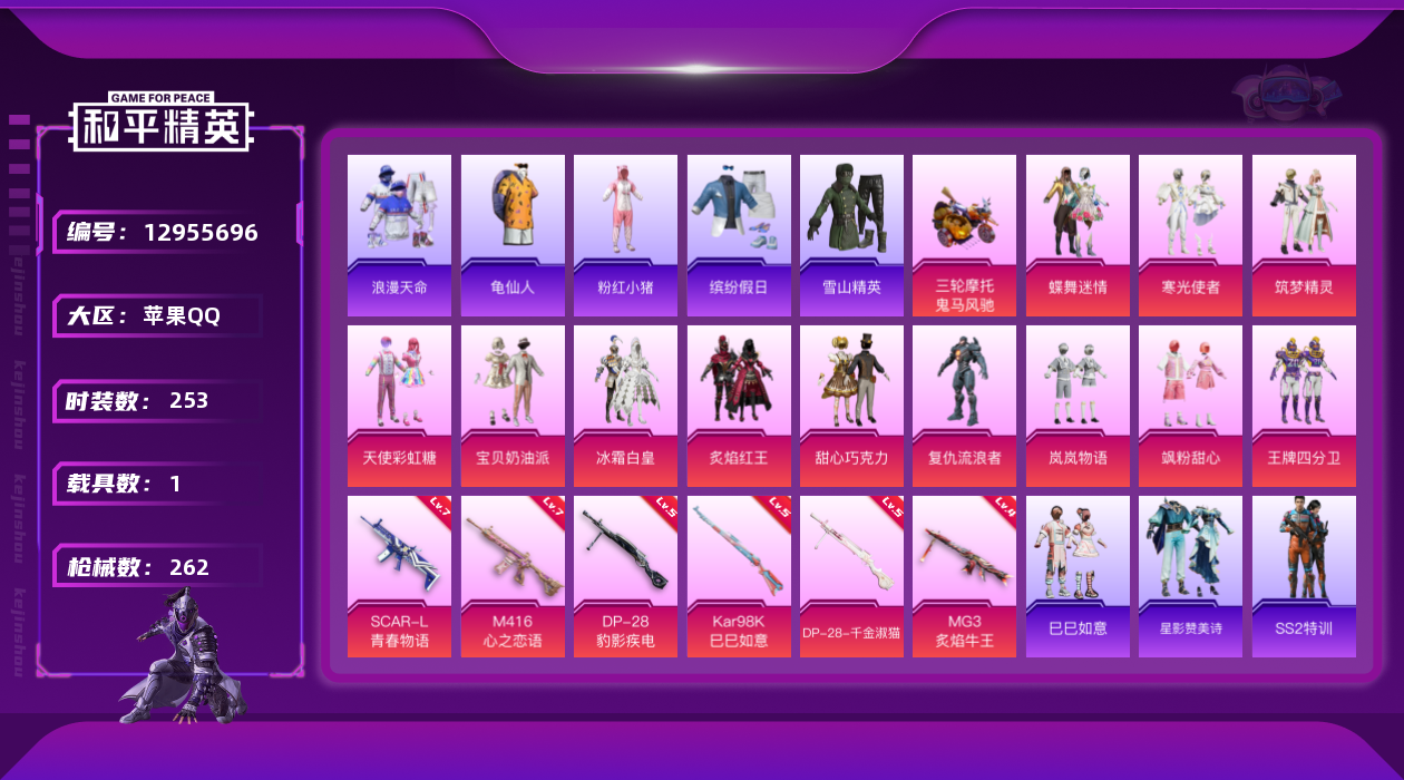 [12955696]素材身法号 苹果 手Q-12粉装-6特效枪-1载具-3粉色飞行器-9.2w热力值-21王牌印记-253套装-262枪皮【热门品类】:套装-浪漫天命,套装-胖达圆圆,套装-动感兔斯基人偶服,套装-龟仙人,套装-潮萌小黄鸭,套装-浪漫波比,套装-粉红小猪,套装-萌熊伴侣【粉色载具】:鬼马风驰【粉色套装】:粉装-甜心巧克力,粉装-宝贝奶油派,粉装-天使彩虹糖,粉装-蝶舞迷情,粉装-冰霜白皇,粉装-炙焰红王,粉装-王牌四分卫,粉装-岚岚物语,粉装-筑梦精灵,角色-复仇流浪者,粉装-寒光使者,粉装-飒粉甜心【粉色枪皮等级】:SCAR-L-青春物语(七级),M416-心之恋语(七级),Kar98K-巳巳如意(五级),DP-28-千金淑猫(五级),DP-28-豹影疾电(五级),MG3-炙焰牛王(四级)【粉色飞行器】:梦幻火箭飞行器,阿狸红飞行器,星夜魔法师飞行翼