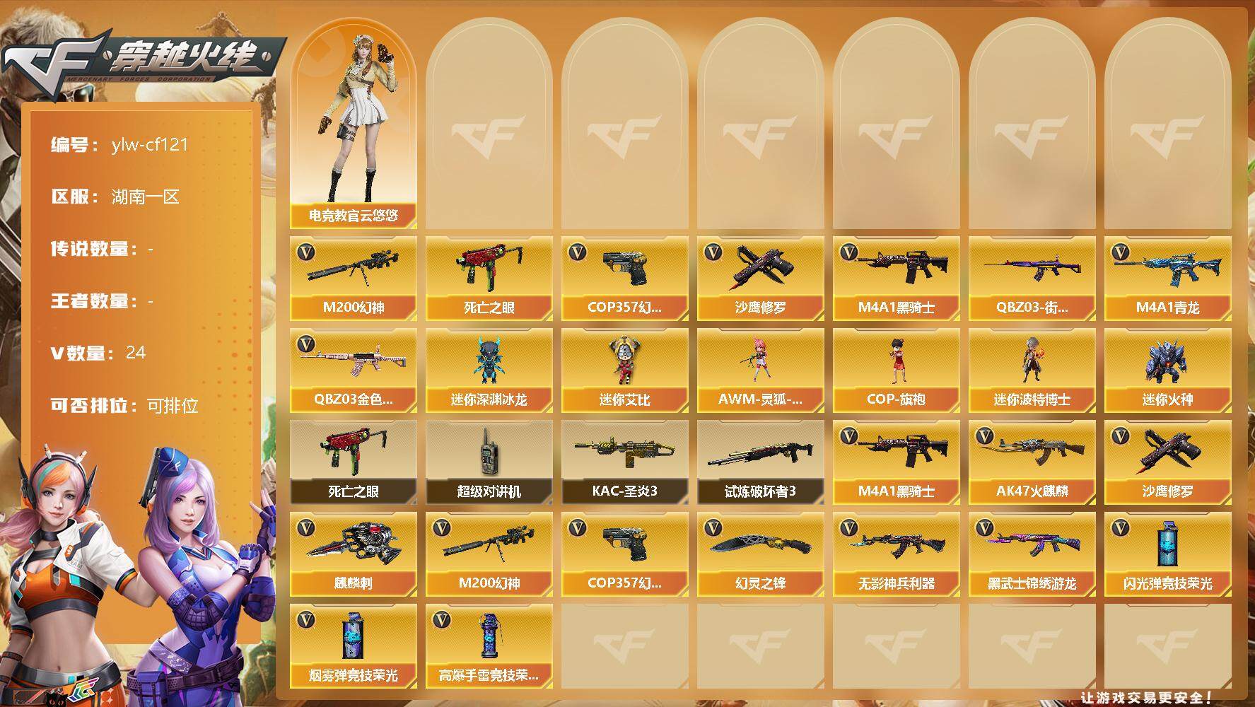 [12953832]湖南一区-24V-0王者-0炫金 【热门武器】:M200-幻神,M4A1-黑骑士,QBZ03-街机,死亡之眼,COP 357-幻灵,沙鹰-修罗 【稀有皮肤】:M200-庆典-CFS 2021 【角色】:电竞教官-云悠悠 【人偶武器】:迷你深渊冰龙,迷你艾比,AWM-灵狐-15周年嘉年华,COP-旗袍,迷你波特博士,迷你深渊冰龙,迷你火种 【暴走生化】:死亡之眼,超级对讲机 【挑战大师】:KAC-圣炎切割者III,试炼破坏者III 【英雄级武器】:无影-神兵利器,黑武士-锦绣游龙,闪光弹-竞技荣光,烟雾弹-竞技荣光,高爆手雷-竞技荣光,M4A1-黑骑士,AK47-火麒麟,沙鹰-修罗,麒麟刺,M4A1-青龙,M200-幻神,QBZ03-金色蔷薇,COP 357-幻灵,幻灵之锋