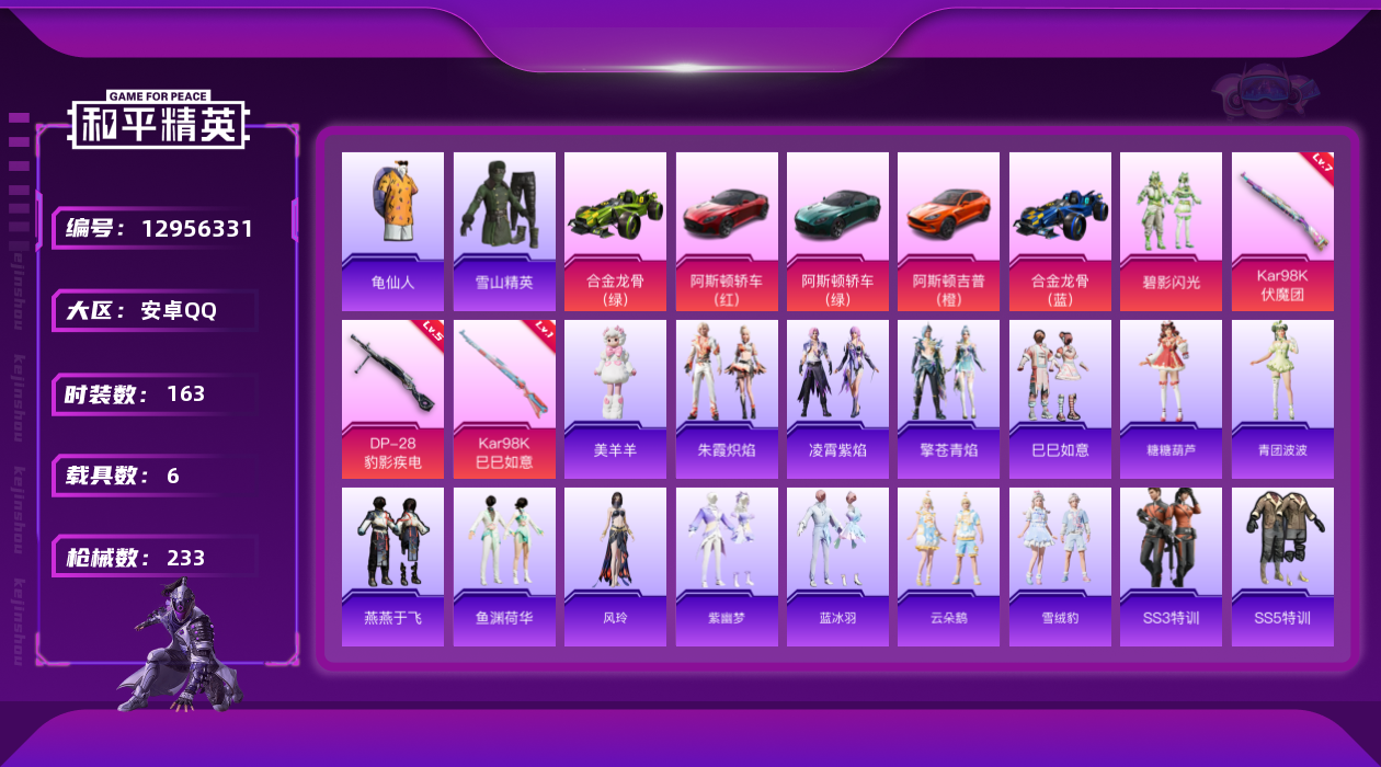 [12956331]素材身法号 安卓 手Q-1粉装-3特效枪-6载具-1粉色飞行器-6.8w热力值-2王牌印记-163套装-233枪皮【热门品类】:套装-龟仙人【粉色载具】:阿斯顿马丁DBS(红),阿斯顿马丁DBS(绿),阿斯顿马丁DBX(橙),合金龙骨(蓝),合金龙骨(绿),空客H135-蔚蓝之翼【粉色套装】:粉装-碧影闪光【粉色枪皮等级】:Kar98K-伏魔团(七级),Kar98K-巳巳如意(一级),DP-28-豹影疾电(五级)【粉色飞行器】:伏魔团飞行器