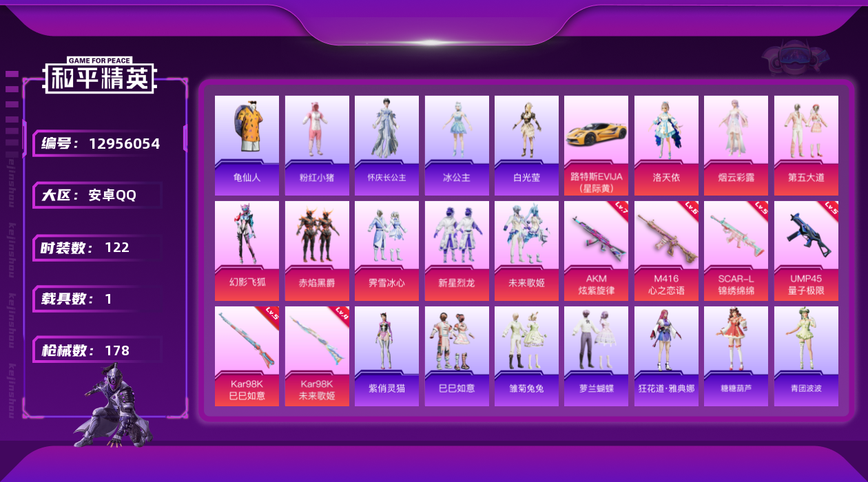 [12956054]素材身法号/绝世印记1/地铁满天赋 安卓 手Q-9粉装-6特效枪-1载具-2粉色飞行器-6.2w热力值-4王牌印记-122套装-178枪皮【热门品类】:粉装-梦幻火箭,套装-深海小丑鱼,套装-龟仙人,套装-粉红小猪【粉色载具】:路特斯EVIJA(星际黄)【粉色套装】:粉装-梦幻火箭,粉装-新星烈龙,角色-洛天依,粉装-赤焰黑爵,粉装-霁雪冰心,粉装-第五大道,粉装-未来歌姬,角色-烟云彩露,粉装-幻影飞狐【粉色枪皮等级】:AKM-炫紫旋律(七级),SCAR-L-锦绣绵绵(五级),M416-心之恋语(六级),UMP45-量子极限(五级),Kar98K-未来歌姬(四级),Kar98K-巳巳如意(五级)【粉色飞行器】:梦幻火箭飞行器,脆鲨七海飞行器