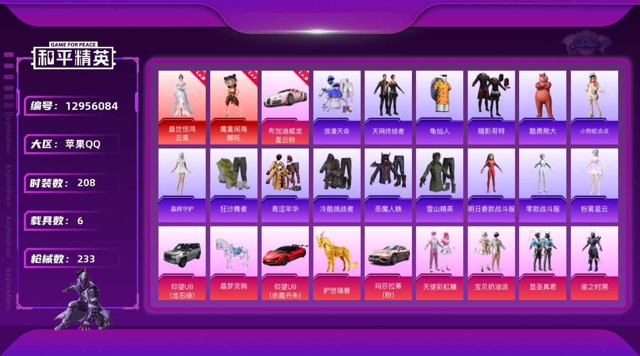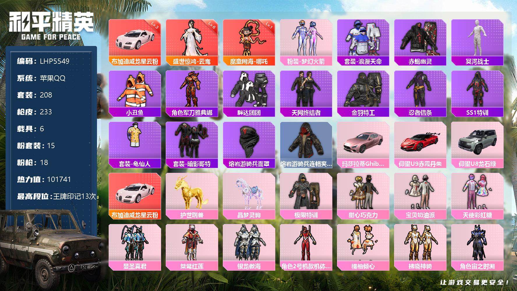 [12956084]素材身法号/绝世印记1/6级红装可随意切换/盛世惊鸿-云鸾(六级)/老木乃伊/地铁满天赋 苹果 手Q-2神装-15粉装-18特效枪-6载具-7粉色飞行器-10.1w热力值-13王牌印记-208套装-233枪皮【红色载具】:布加迪威龙(星云粉)(三级)【红色神装等级】:魔童闹海-哪吒(一级),盛世惊鸿-云鸾(六级)【热门品类】:粉装-梦幻火箭,套装-浪漫天命,套装-赤蝎幽灵,套装-冥河战士,套装-小丑鱼,角色-军刀雅典娜,套装-胖达团团,套装-天网终结者,套装-金羽特工,套装-忍者信条,套装-SS1特训,套装-龟仙人,套装-暗影哥特,熔岩游骑兵面罩,熔岩游骑兵连帽夹克【粉色载具】:玛莎拉蒂Ghibli(粉),仰望U9(赤霞丹朱),仰望U8(龙石绿),布加迪威龙(星云粉),护世瑞兽,晶梦灵驹【粉色套装】:粉装-极限特训,粉装-甜心巧克力,粉装-宝贝奶油派,粉装-天使彩虹糖,粉装-梦幻火箭,粉装-显圣真君,粉装-桀骜红莲,粉装-银龙傲海,角色-2号机款机体服,粉装-橘柚倾心,粉装-拂晓神骑,角色-宙之时溯,角色-星云暗核,角色-烟云彩露,角色-晶梦幻蝶【粉色枪皮等级】:SCAR-L-机甲封神(一级),SCAR-L-万古烈焰(六级),SCAR-L-金蛇镇世(一级),SCAR-L-魔童闹海 哪吒(一级),M416-五爪金龙(一级),M416-女娲灵识(三级),GROZA-镜光银凌(五级),AUG-暖羊咩咩(五级),蜜獾-辉耀战甲(四级),P90-沙丘之主(一级),Kar98K-巳巳如意(一级),M24-镜域双华(一级),Mk14-盛世惊鸿(三级),DP-28-豹影疾电(二级),MG-36-幻梦之森(三级),MG-36-沧焰双生(一级),烟雾弹-丁香清露(五级),破片手榴弹-热量炸弹(六级)【粉色飞行器】:拂晓神骑飞行器,沙丘之主天马,镜域双华-灵镜之阶,龙翔九天飞行器,凤舞九天飞行器,万象金身飞行器,飞天猪飞行器