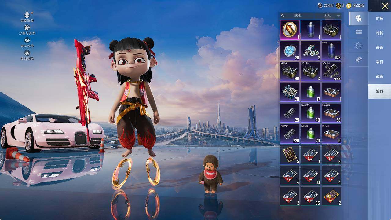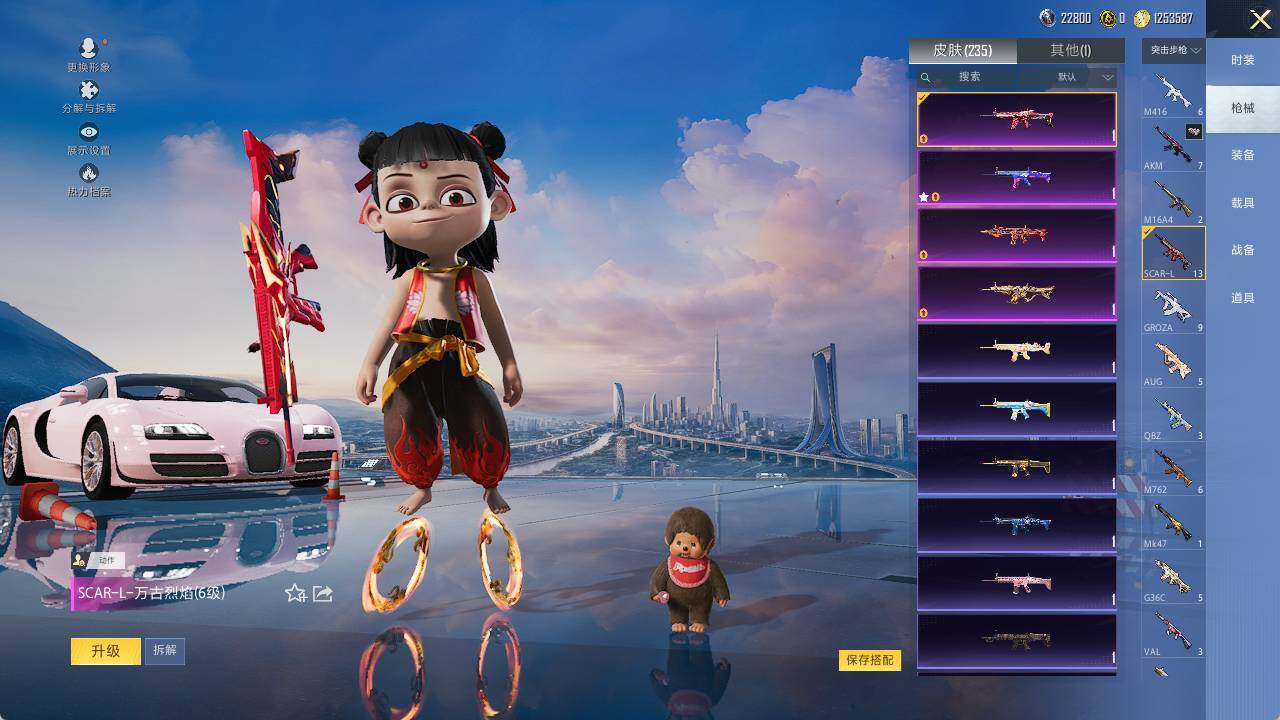 SCAR-L-机甲封神,SCAR-L-金蛇镇世,M416-五爪金龙,M416-女娲灵识,GROZA-镜光银凌,AUG-暖羊咩咩,蜜獾-辉耀战甲,P90-沙丘之主,Kar98K-巳巳如意,M24-镜域双华,Mk14-盛世惊鸿,MG-36-幻梦之森,烟雾弹-丁香清露,破片手榴弹-热量炸弹
