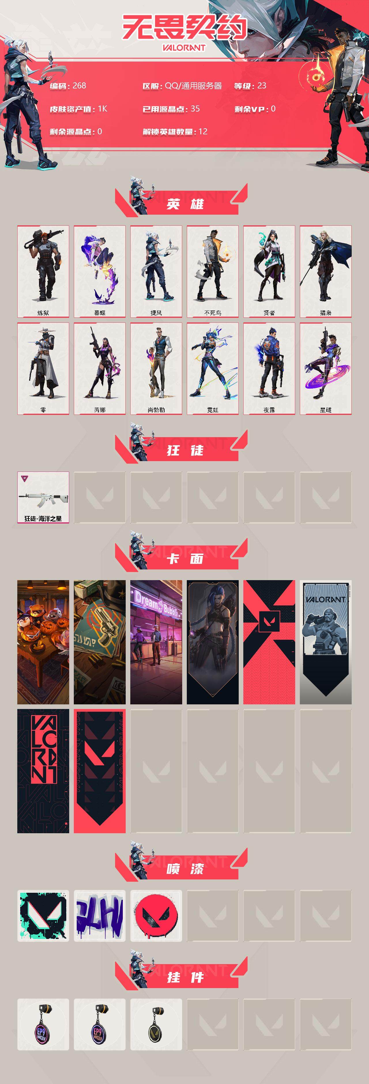 [12956499]【英雄】:炼狱,暮蝶,捷风,不死鸟,贤者,猎枭,零,芮娜,尚勃勒,霓虹,夜露,星礈 【狂徒】:狂徒-海洋之星 【卡面】:南瓜盛典 卡面,正义的化身 卡面,梦幻奶茶 卡面,《双城之战》金克丝 卡面,代号红色 卡面,新兵报到 卡面,V契约 卡面,无畏契约 卡面 【喷漆】:胜利属于无畏契约 喷漆,GLHF 喷漆,无畏契约 喷漆 【挂饰】:第九季//第三幕 纪念币 挂饰,第九季//第二幕 纪念币 挂饰,无畏契约 纪念币 挂饰