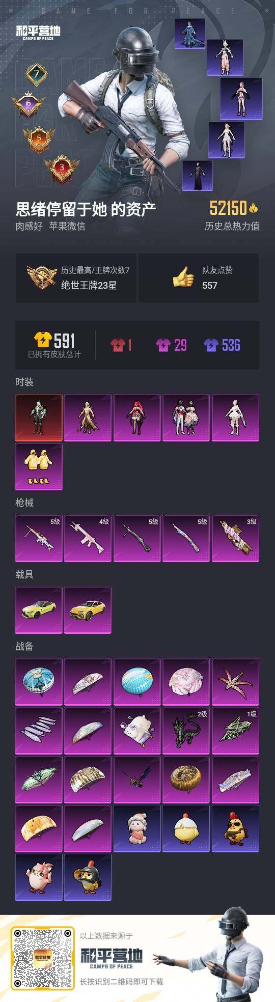- [13630122]苹果 手Q-7粉装-7特效枪-2载具-2粉色飞行器-42665热力值-8王牌印记-100套装-122枪皮 【热门品类】:粉装-缤纷油彩,套装-浪漫天命,套装-深海小丑鱼,套装-小丑鱼,套装-胖达圆圆,套装-龟仙人,套装-暗影哥特 【粉色载具】:宾利飞驰(布罗德盖棕双色),仰望U9(赤霞丹朱) 【粉色套装】:粉装-缤纷油彩,粉装-放客神游,粉装-山涧鹿灵,粉装-橘柚倾心,角色-白勺歌姬,角色-白兰星,角色-萨利娅 【粉色枪皮等级】:SCAR-L-锦绣绵绵(五级),M416-心之恋语(七级),AUG-暖羊咩咩(五级),UMP45-量子极限(五级),Kar98K-巳巳如意(五级),M24-镜域双华(三级),DP-28-豹影疾电(五级) 【粉色枪皮】:SCAR-L-锦绣绵绵,M416-心之恋语,AUG-暖羊咩咩,UMP45-量子极限,Kar98K-巳巳如意,M24-镜域双华,DP-28-豹影疾电 【粉色飞行器】:镜域双华-灵镜之阶,凤舞九天飞行器 【粉色降落伞】:圣堂之誓降落伞,镜域双华降落伞,星梦奇缘降落伞 【稀有套装】:套装-龟仙人,套装-巳巳如意,套装-雏菊兔兔,套装-萝兰蝴蝶,套装-燕燕于飞,套装-鱼渊荷华,角色-海琴烟,套装-晶辉守护,角色-瑰梦爱神,角色-绛羽幽主 【稀有枪皮】:AKM-彩虹符号,AKM-缤纷海域,AKM-霓虹街区,AKM-龙的传人,SCAR-L-炫彩节奏,M416-糯团青竹,M416-红色方程式,GROZA-影袭,GROZA-田园牧歌,AUG-耀粉歌者,QBZ-未来歌姬,M762-天降萌叽,AC-VAL-快闪甜心,蜜獾-天降萌叽,Famas-镜域双华,UZI-啾咪啾咪,UZI-天降萌叽,UZI-盛世惊鸿,UMP45-春暖花开,UMP45-涂山之恋,Vector-焰鹰斗篷,Vector-生命誓言,Vector-田园牧歌,汤姆逊-天降萌叽,汤姆逊-耀粉歌者,AKS-74U-鬼刀,P90-快闪甜心,P90-巳巳如意,Kar98K-彩虹符号,M24-影袭,AWM-焰鹰斗篷,SKS-炫彩节奏,SKS-迅猛狂鲨,VSS-田园牧歌,Mini14-穿刺龙虾,Mk14-童趣迷兔,SLR-彩虹符号,AMR-鬼刀,M417-惊鸿侠骨,MK20-H-快闪甜心,M200-仲夏莫吉托,M200-惊鸿侠骨,S686-生命誓言,S686-巳巳如意,S12K-玩趣呆呆,S12