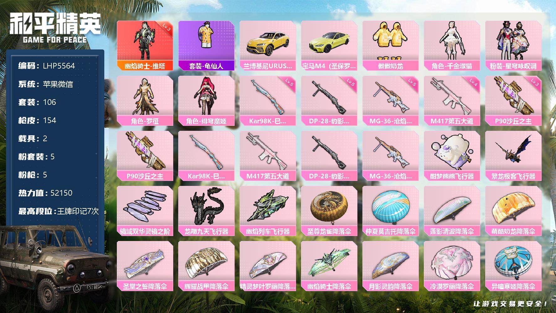 - [13751934]【店主推荐捡漏号!可直接换绑】 苹果 手Q-7粉装-6特效枪-5粉色飞行器-4.7w热力值-10王牌印记-99套装-130枪皮【热门品类】:粉装-梦幻火箭,粉装-缤纷油彩,套装-龟仙人,套装-粉红小猪,撬棍-龙胆亮银枪,套装-红熊茄茄【粉色套装】:粉装-梦幻火箭,粉装-缤纷油彩,角色-洛天依,粉装-暖暖奶龙,粉装-憨憨奶龙,粉装-傲傲奶龙,粉装-金丰海韵【粉色枪皮等级】:AKM-梦之光华(五级),SCAR-L-纯梦嫁纱(六级),M416-心之恋语(七级),Kar98K-巳巳如意(一级),DP-28-豹影疾电(一级),MG3-酷泡奶龙(五级)【粉色飞行器】:梦幻火箭飞行器,璀璨巨星飞行器,萌酷奶龙飞行器,冠军兔兔飞行器,雀灵庇佑飞行器