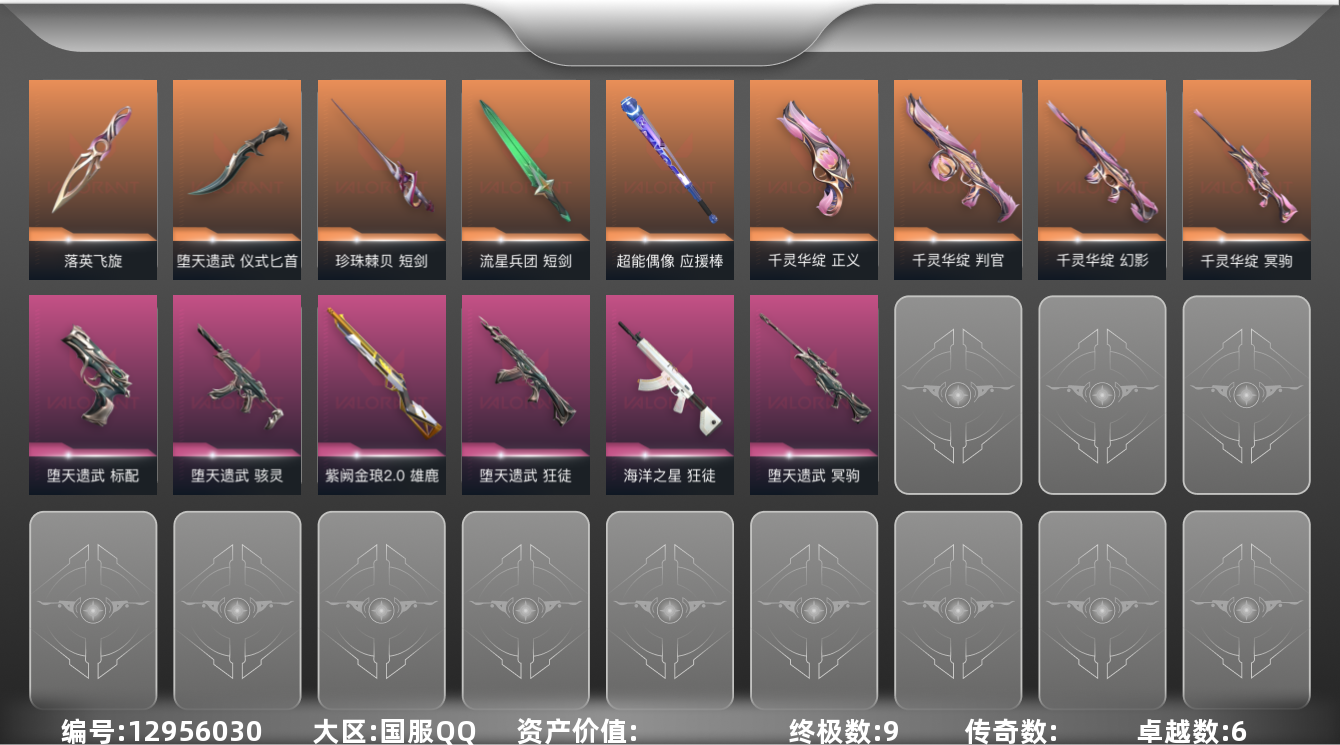 [12956030]【套装】:千灵华绽套装,堕天遗武套装 【英雄】:炼狱,维斯,暮蝶,钛狐,壹决,铁臂,捷风,雷兹,幽影,不死鸟,贤者,猎枭,蝰蛇,零,芮娜,奇乐,尚勃勒,霓虹,斯凯,夜露,星礈,K/O,海神,盖可,黑梦,钢锁 【近战 武器】:近战武器-落英飞旋,近战武器-珍珠棘贝 短剑,近战武器-流星兵团 短剑,近战武器-超能偶像 应援棒,近战武器-堕天遗武 仪式匕首 【狂徒】:狂徒-堕天遗武,狂徒-海洋之星,狂徒-超能偶像,狂徒-流星兵团 【幻影】:幻影-千灵华绽,幻影-珍珠棘贝,幻影-聚合之力 【戍卫】:戍卫-超能偶像,戍卫-珍珠棘贝,戍卫-战术熊与伙伴们 【獠犬】:獠犬-采蜜小蜂队,獠犬-复古浪潮 【冥驹】:冥驹-千灵华绽,冥驹-堕天遗武,冥驹-复古浪潮 【飞将】:飞将-聚合之力,飞将-战术熊与伙伴们 【莽侠】:莽侠-深海水族,莽侠-纤云弄巧 【战神】:战神-采蜜小蜂队,战神-深海水族 【奥丁】:奥丁-流星兵团 【判官】:判官-千灵华绽,判官-超能偶像,判官-采蜜小蜂队 【雄鹿】:雄鹿-紫阙金琅//2.0,雄鹿-复古浪潮 【骇灵】:骇灵-堕天遗武,骇灵-流星兵团,骇灵-珍珠棘贝 【蜂刺】:蜂刺-聚合之力,蜂刺-深海水族,蜂刺-纤云弄巧 【标配】:标配-堕天遗武,标配-超能偶像,标配-战术熊与伙伴们 【正义】:正义-千灵华绽,正义-复古浪潮,正义-纳米打击,正义-纤云弄巧 【鬼魅】:鬼魅-流星兵团,鬼魅-采蜜小蜂队 【狂怒】:狂怒-珍珠棘贝,狂怒-聚合之力,狂怒-战术熊与伙伴们 【短炮】:短炮-深海水族,短炮-纤云弄巧 【卡面】:终章:激斗汉堡 卡面,进入射程 卡面,《双城之战》拥抱 卡面,精灵大战 卡面,欢迎来到底城 卡面,南瓜盛典 卡面,修车达人 卡面,正义的化身 卡面,终章:生意人麦宝 卡面,铁之华 卡面,失而复得 卡面,时间到 卡面,最高舞台 卡面,复活专家 卡面,归乡 // 蝰蛇 卡面,超能偶像 卡面,生意人麦宝 卡面,声感陷阱设计图 卡面,钢锁工牌 卡面,战术小伙伴的夏日 卡面,采蜜小蜂队 卡面,聚合之力 卡面,梦幻奶茶 卡面,终章:打造专属狂徒 卡面,趁热吃 卡面,西装暴徒 卡面,失控边缘 卡面,哨卫者之领域 卡面,暮蝶工牌 卡面,战术熊与伙伴们 卡面,源能反应 卡面,流星兵团 卡面,纤云弄巧 卡面,暂别喧嚣 卡面,打造专属狂徒 卡面,零点嗅探设计图 卡面,表象之