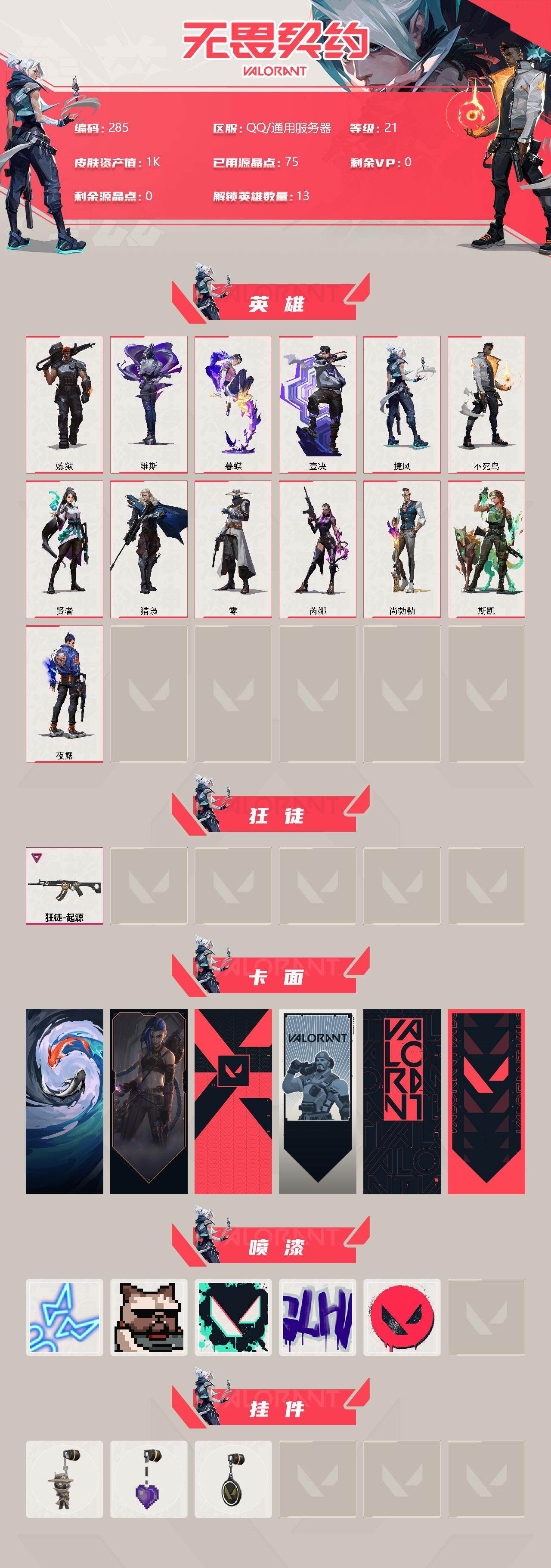 [12956609]【英雄】:炼狱,维斯,暮蝶,壹决,捷风,不死鸟,贤者,猎枭,零,芮娜,尚勃勒,斯凯,夜露 【狂徒】:狂徒-起源 【卡面】:红鳞松叶 卡面,《双城之战》金克丝 卡面,代号红色 卡面,新兵报到 卡面,V契约 卡面,无畏契约 卡面 【喷漆】:霓光四射 喷漆,关门放狗 喷漆,胜利属于无畏契约 喷漆,GLHF 喷漆,无畏契约 喷漆 【挂饰】:无畏契约GO!第一卷 零 挂饰,薰衣草之心 挂饰,无畏契约 纪念币 挂饰