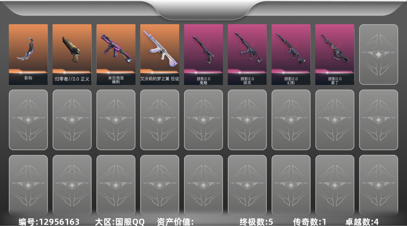 [12956163]【套装】:2025全球冠军赛套装,掠影//2.0套装 【英雄】:炼狱,暮蝶,壹决,捷风,雷兹,不死鸟,贤者,猎枭,芮娜,尚勃勒,盖可,黑梦 【近战 武器】:近战武器-2025全球冠军赛 蝴蝶刀,近战武器-影钩 【狂徒】:狂徒-艾沃莉的梦之翼,狂徒-2025全球冠军赛 【幻影】:幻影-掠影//2.0 【奥丁】:奥丁-掠影//2.0 【骇灵】:骇灵-掠影//2.0 【蜂刺】:蜂刺-末日泡泡 【正义】:正义-归零者//2.0 【鬼魅】:鬼魅-掠影//2.0 【卡面】:树懒大作战 卡面,红鳞松叶 卡面,《双城之战》金克丝 卡面,别冒尖 卡面,代号红色 卡面,新兵报到 卡面,V契约 卡面,无畏契约 卡面 【喷漆】:霓光四射 喷漆,买装还是存钱 喷漆,关门放狗 喷漆,胜利属于无畏契约 喷漆,GLHF 喷漆,无畏契约 喷漆 【挂饰】:无畏契约GO!第一卷 芮娜 挂饰,无畏契约GO!第一卷 零 挂饰,《双城之战》魄罗 挂饰,无畏契约 纪念币 挂饰