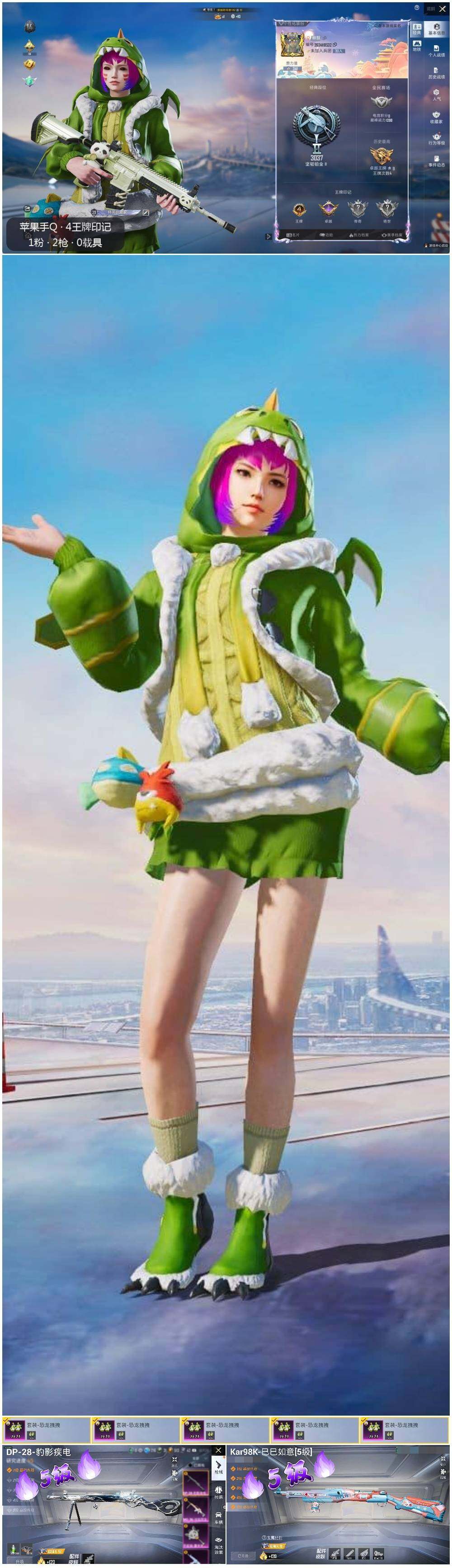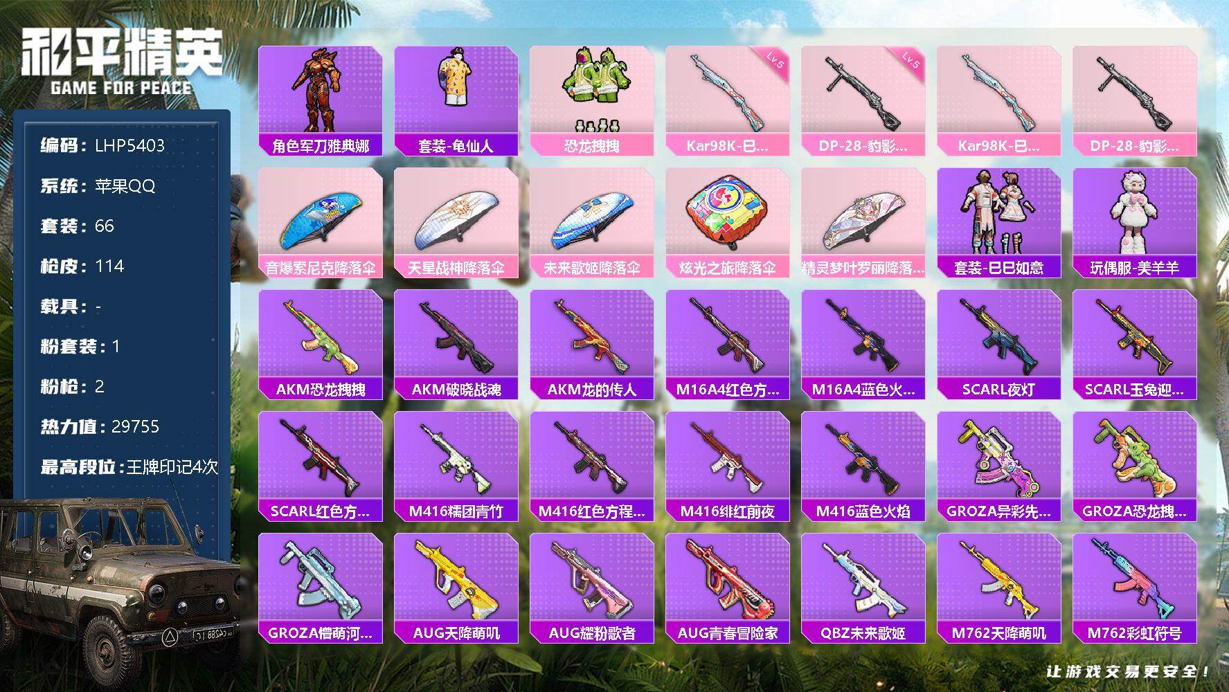 [12954837]【特价急出/详情看图】:苹果 手Q-1粉装-2特效枪-2.9w75热力值-4王牌印记-66套装-114枪皮【热门品类】:角色-军刀雅典娜,套装-龟仙人【粉色套装】:粉装-恐龙拽拽【粉色枪皮等级】:Kar98K-巳巳如意(五级),DP-28-豹影疾电(五级)