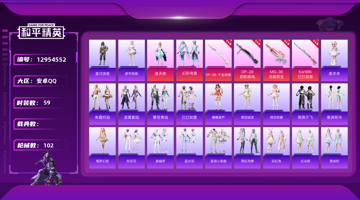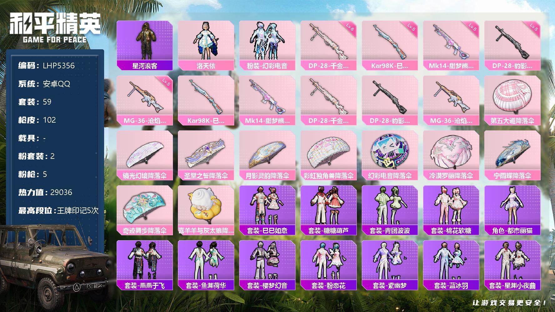 [12954552]地铁满天赋【特价急出/详情看图】:安卓 手Q-2粉装-5特效枪-2.9w热力值-5王牌印记-59套装-102枪皮【热门品类】:套装-星河浪客【粉色套装】:角色-洛天依,粉装-幻彩电音【粉色枪皮等级】:Kar98K-巳巳如意(五级),Mk14-甜梦熊击(五级),DP-28-千金淑猫(六级),DP-28-豹影疾电(五级),MG-36-沧焰双生(五级)