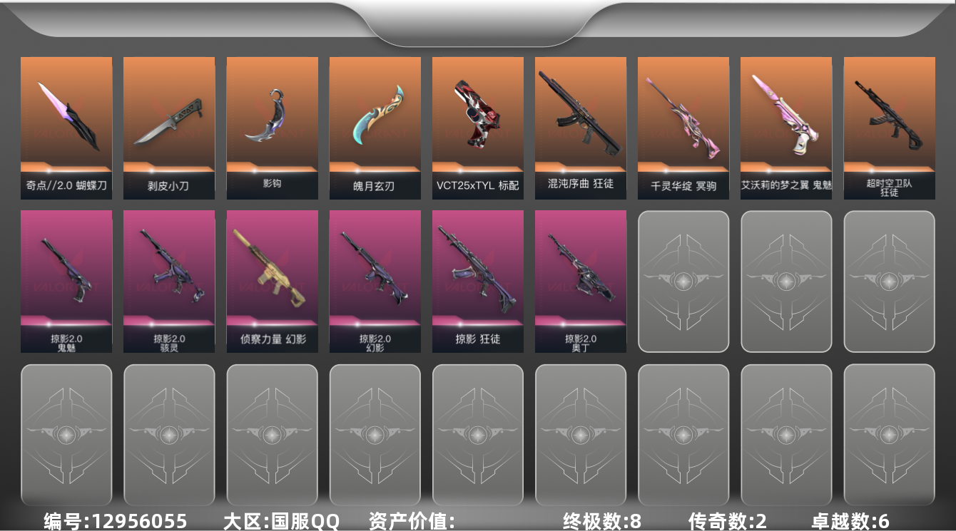 [12956055]【套装】:掠影//2.0套装 【英雄】:幻棱,炼狱,暮蝶,钛狐,壹决,铁臂,捷风,雷兹,幽影,不死鸟,贤者,猎枭,零,芮娜,尚勃勒,夜露,盖可,黑梦,钢锁 【近战 武器】:近战武器-影钩,近战武器-剥皮小刀,近战武器-奇点//2.0 蝴蝶刀,近战武器-魄月玄刃 【狂徒】:狂徒-超时空卫队,狂徒-混沌序曲,狂徒-掠影 【幻影】:幻影-侦察力量,幻影-掠影//2.0 【冥驹】:冥驹-千灵华绽 【奥丁】:奥丁-掠影//2.0 【骇灵】:骇灵-掠影//2.0 【VCT手枪】:标配-VCT25 x TYL 【鬼魅】:鬼魅-艾沃莉的梦之翼,鬼魅-掠影//2.0,鬼魅-诡秘蛇影 【卡面】:精灵大战 卡面,南瓜盛典 卡面,热舞环节 卡面,无畏契约GO!第一卷:芮娜 卡面,无畏契约GO!第一卷:零 卡面,《双城之战》金克丝 卡面,钢锁vs盖可 卡面,别冒尖 卡面,代号红色 卡面,新兵报到 卡面,V契约 卡面,无畏契约 卡面 【喷漆】:控场勿近 喷漆,审判之爪 喷漆,买装还是存钱 喷漆,酷熊冲浪 喷漆,胜利属于无畏契约 喷漆,GLHF 喷漆,无畏契约 喷漆 【挂饰】:伞绳 挂饰,第九季//第三幕 纪念币 挂饰,天外飞客 挂饰,无畏契约 纪念币 挂饰