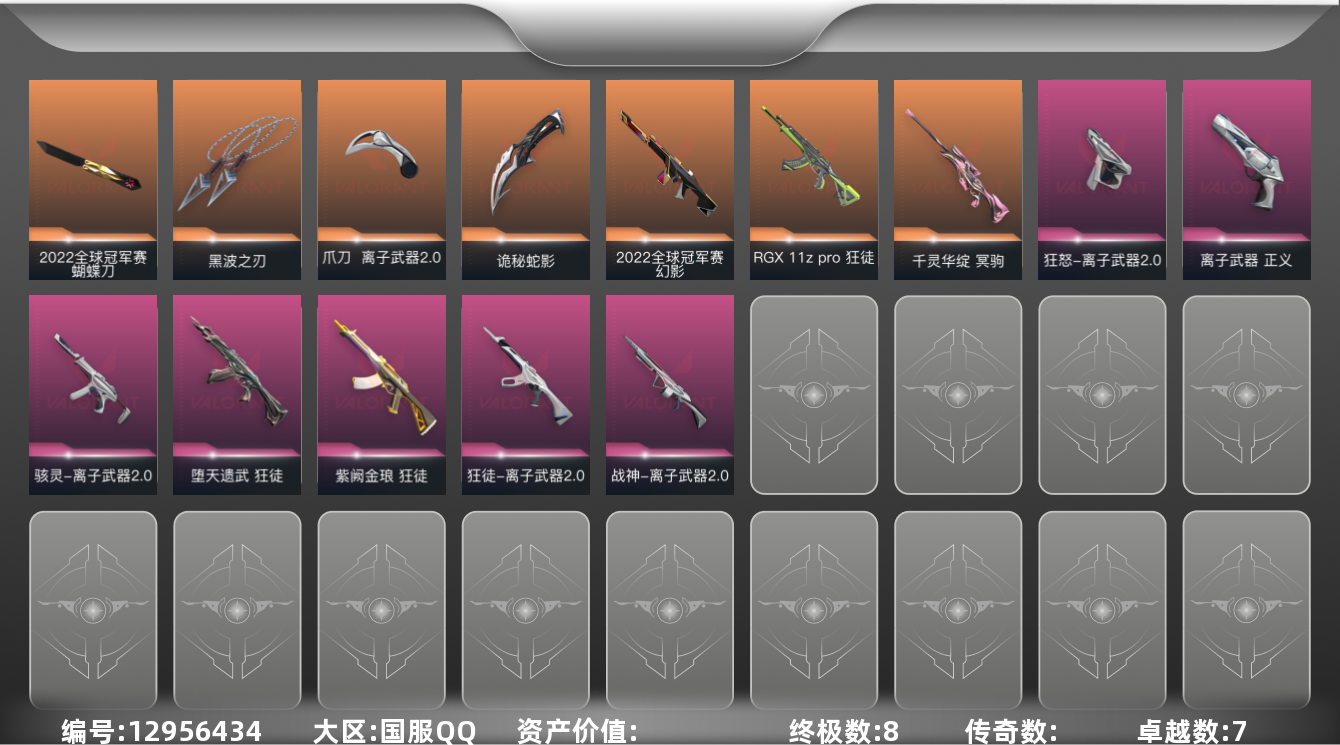 [12956434]【套装】:2022全球冠军赛套装,离子武器//2.0套装 【英雄】:幻棱,炼狱,维斯,暮蝶,钛狐,壹决,铁臂,捷风,雷兹,幽影,不死鸟,贤者,猎枭,蝰蛇,零,芮娜,奇乐,尚勃勒,霓虹,斯凯,夜露,星礈,K/O,海神,盖可,黑梦,钢锁 【近战 武器】:近战武器-2022全球冠军赛 蝴蝶刀,近战武器-黑波之刃,近战武器-离子武器//2.0 爪刀,近战武器-诡秘蛇影 军刀 【狂徒】:狂徒-RGX 11z Pro,狂徒-堕天遗武,狂徒-紫阙金琅,狂徒-离子武器//2.0,狂徒-诡秘蛇影 【幻影】:幻影-2022全球冠军赛,幻影-末日之翼 【戍卫】:戍卫-折光棱晶 【冥驹】:冥驹-千灵华绽 【飞将】:飞将-末日之翼 【莽侠】:莽侠-诡秘蛇影 【战神】:战神-离子武器//2.0 【奥丁】:奥丁-末日之翼 【判官】:判官-诡秘蛇影 【骇灵】:骇灵-离子武器//2.0 【蜂刺】:蜂刺-折光棱晶 【标配】:标配-折光棱晶 【正义】:正义-离子武器 【鬼魅】:鬼魅-诡秘蛇影,鬼魅-星云暗涌 【狂怒】:狂怒-离子武器//2.0 【短炮】:短炮-末日之翼 【卡面】:南瓜盛典 卡面,唱片的故事 卡面,树懒大作战 卡面,红鳞松叶 卡面,无畏契约GO!第一卷:芮娜 卡面,清除名单 卡面,无畏契约GO!第一卷:零 卡面,无垠星环 卡面,《双城之战》金克丝 卡面,无畏契约GO!第一卷:贤者 卡面,代号红色 卡面,新兵报到 卡面,V契约 卡面,无畏契约 卡面 【喷漆】:买装还是存钱 喷漆,酷熊冲浪 喷漆,无畏契约GO!第一卷:芮娜 喷漆,胜利属于无畏契约 喷漆,GLHF 喷漆,无畏契约 喷漆 【挂饰】:第九季//第三幕 纪念币 挂饰,天外飞客 挂饰,好运福爪 挂饰,《双城之战》魄罗 挂饰,无畏契约 纪念币 挂饰