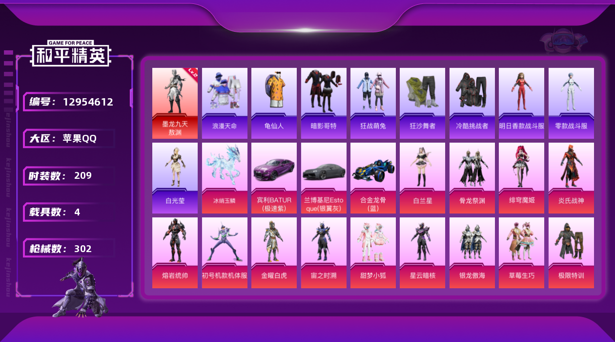 [12954612]素材身法号/老木乃伊/无敌战神框1/绝世印记10/满级m4超新星/扭蛋碎片528【特价急出/详情看图】:苹果 手Q-无敌战神框-1神装-16粉装-12特效枪-4载具-8粉色飞行器-10.2w热力值-19王牌印记-209套装-302枪皮【红色神装等级】:墨龙九天-敖渊(二级)【热门品类】:粉装-梦幻火箭,套装-浪漫天命,套装-都市猎人,套装-冥河战士,套装-派对舞王,套装-奇异狩猎者,套装-浪客战士,套装-龟仙人,套装-暗影哥特,套装-浪漫波比【粉色载具】:兰博基尼Estoque(银翼灰),宾利BATUR(极速紫),合金龙骨(蓝),冰绡玉鳞【粉色套装】:粉装-极限特训,粉装-数码大师,粉装-金曜白虎,粉装-梦幻火箭,粉装-草莓生巧,粉装-银龙傲海,粉装-骨龙祭渊,角色-初号机款机体服,粉装-甜梦小狐,粉装-炎氏战神,角色-白兰星,角色-宙之时溯,角色-星云暗核,角色-熔岩统帅,套装-创世·救赎,角色-绯穹魔姬【粉色枪皮等级】:M416-心之恋语(一级),M416-风花雪月(四级),M416-超新星(九级),AUG-星之彼岸(六级),AUG-超新星(一级),Kar98K-巳巳如意(五级),M24-镜域双华(三级),Mk14-精灵梦叶罗丽(六级),MK12-雪月幻音(四级),DP-28-豹影疾电(五级),MG-36-沧焰双生(五级),破片手榴弹-热量炸弹(七级)【粉色飞行器】:梦幻火箭飞行器,夏日绵绵冰飞行器,黄族统领飞行器,沙丘之主天马,鎏金朋克飞行器,灵猫魔法师飞行器,飞天猪飞行器